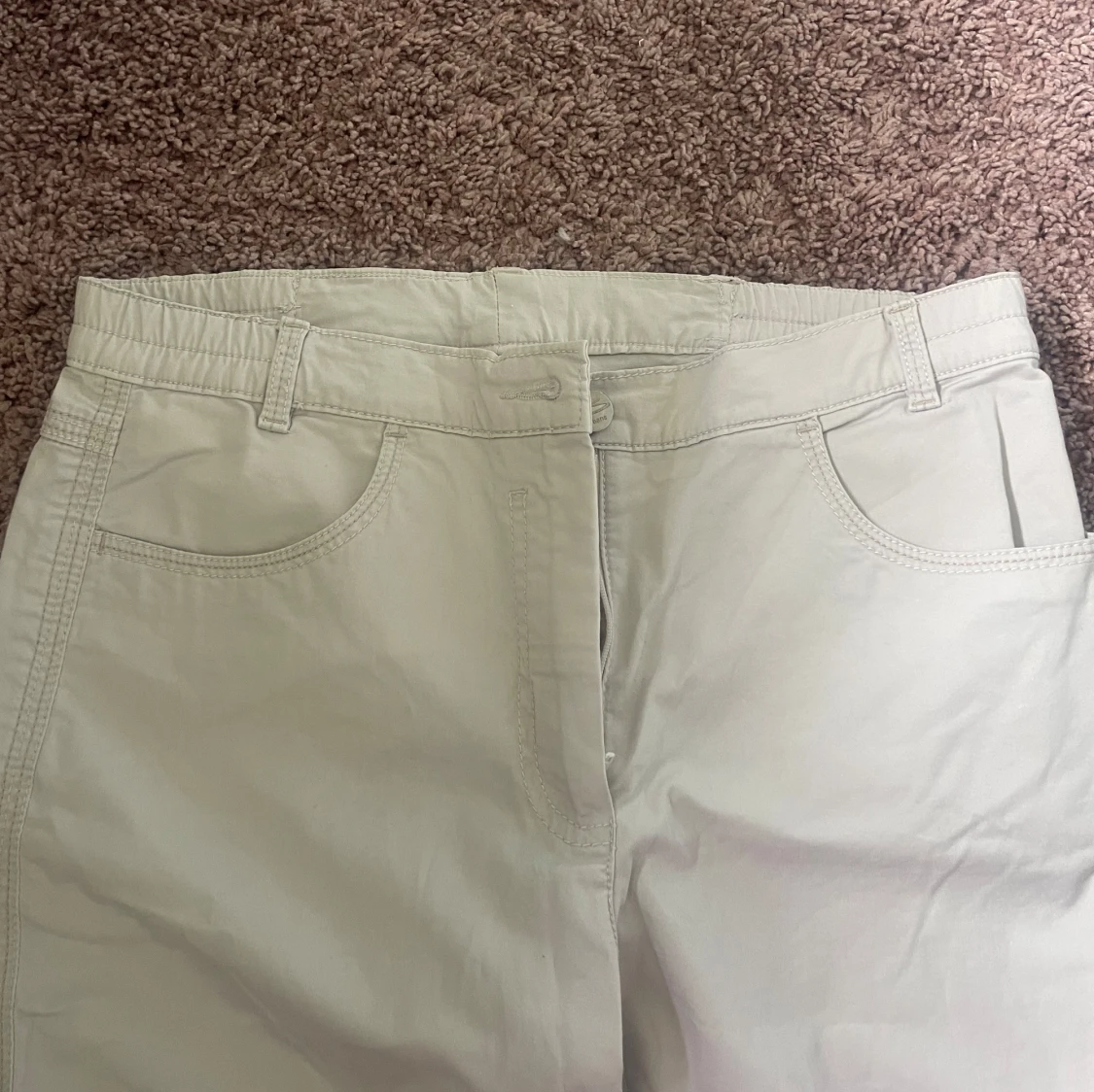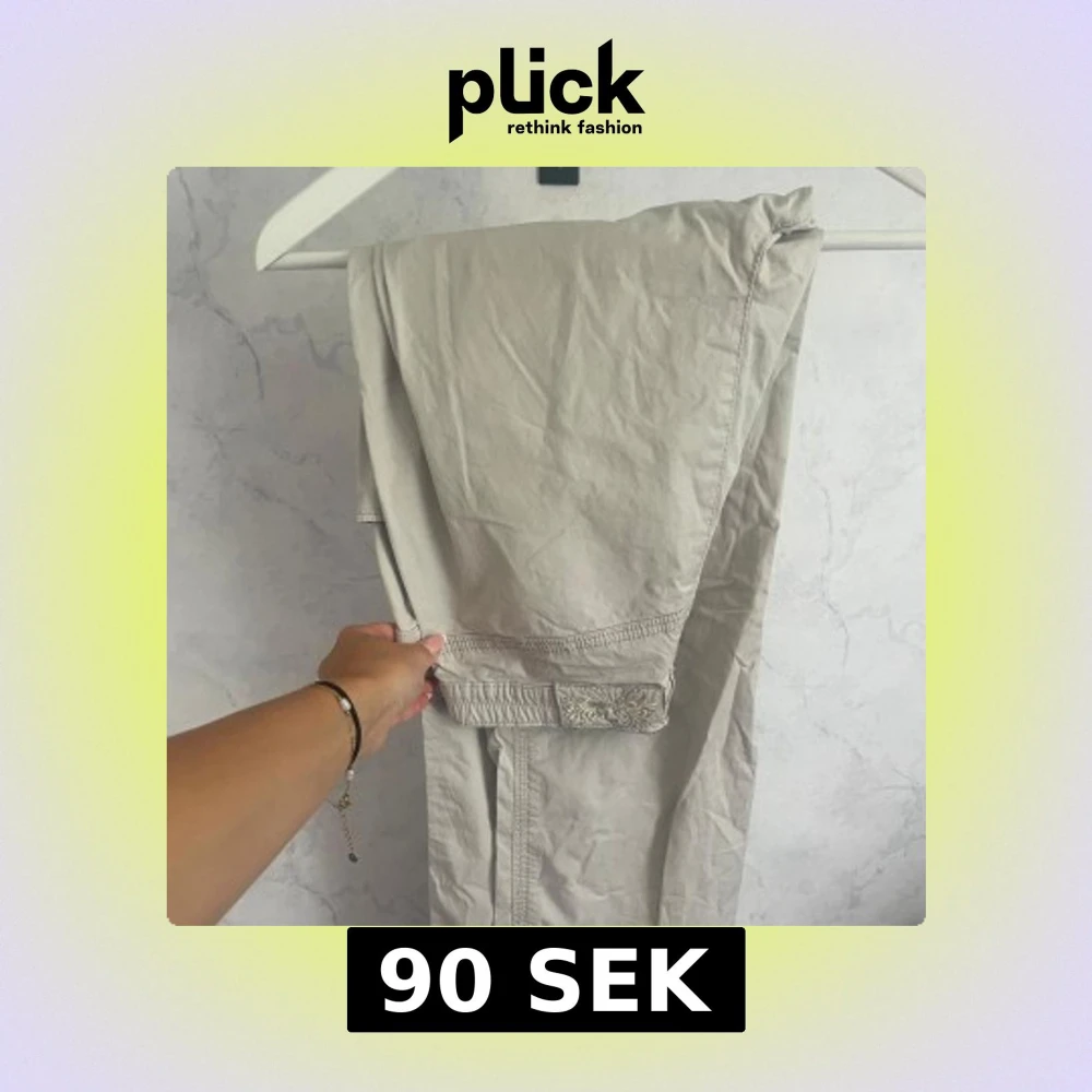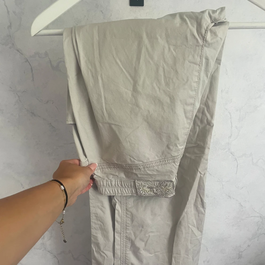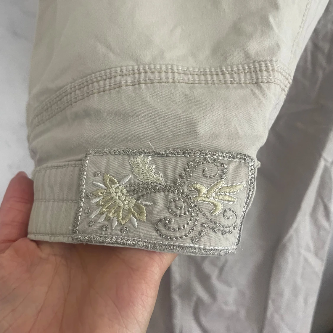 Snygga beige cargopants med broderad detalj i vitt och silver. Raka/ lite utsvängda. Väldigt fina nu till sommarn.