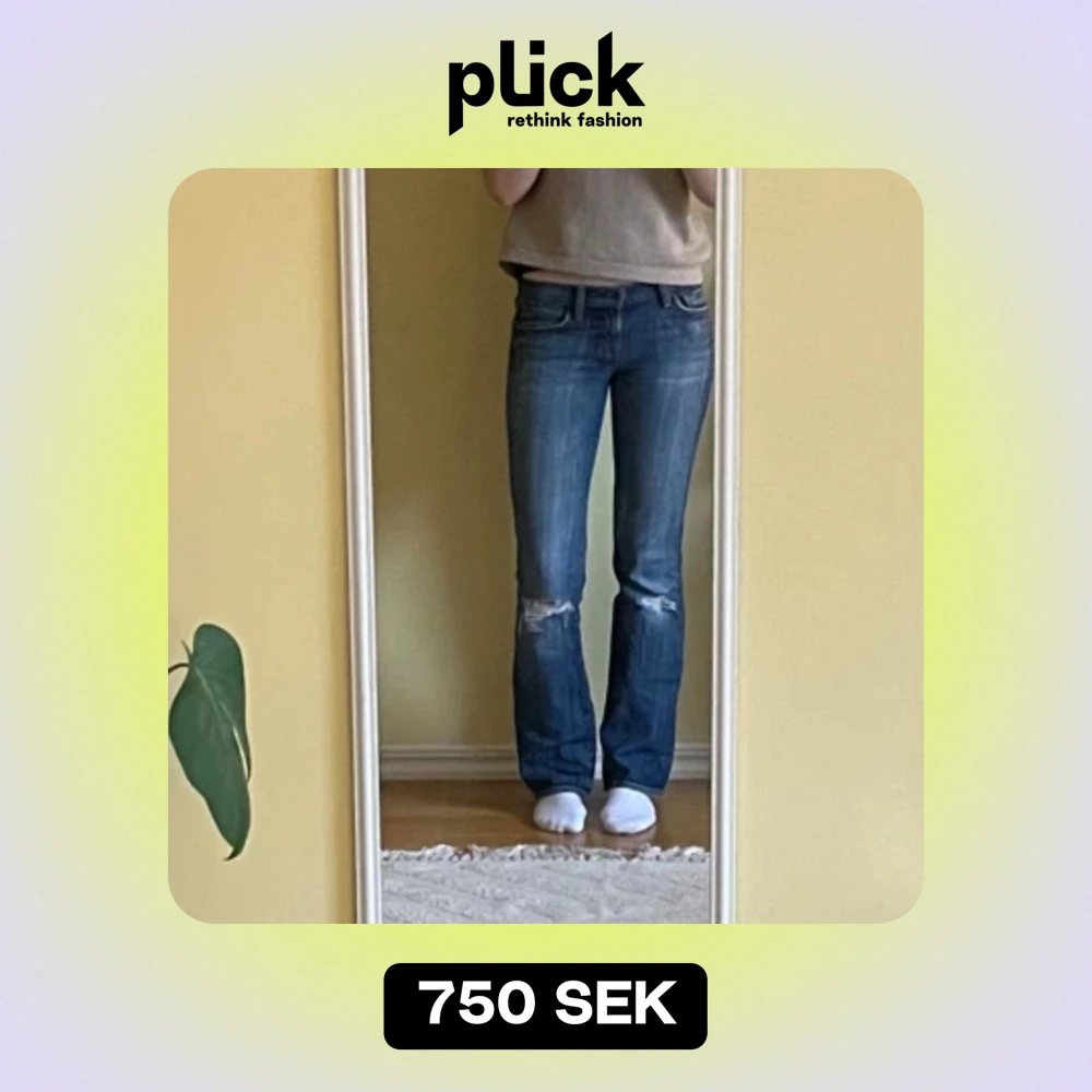 Jag är ca 169 o dem är bra i längden. Jeansen har två hål på knäna, är lågmidjade o bootcut. Dem är från citizens of humanity o modellen är ”Kelly #001”, hör av dig om du har en fråga/är intrsserad!🫶🏻Lägsta tänkbara bud: 600kr
