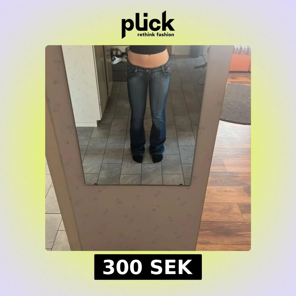 Säljer mina lågmidjade bootcut/ gränsar till fleard jeans då dem e förstora för mig. Köpte secondhand men de är i väldigt bra skick. Passar storlek S/M, är 39cm över midjan.