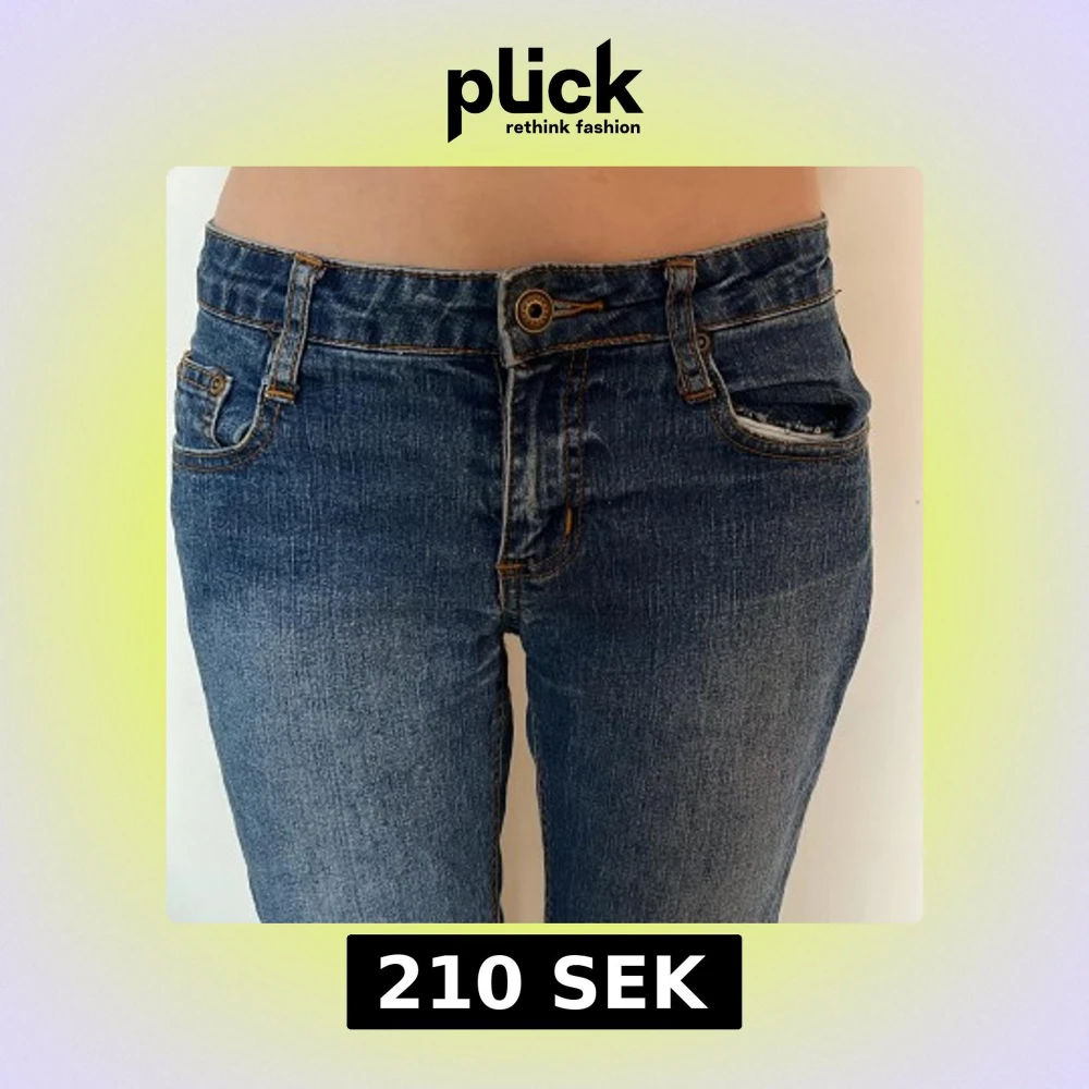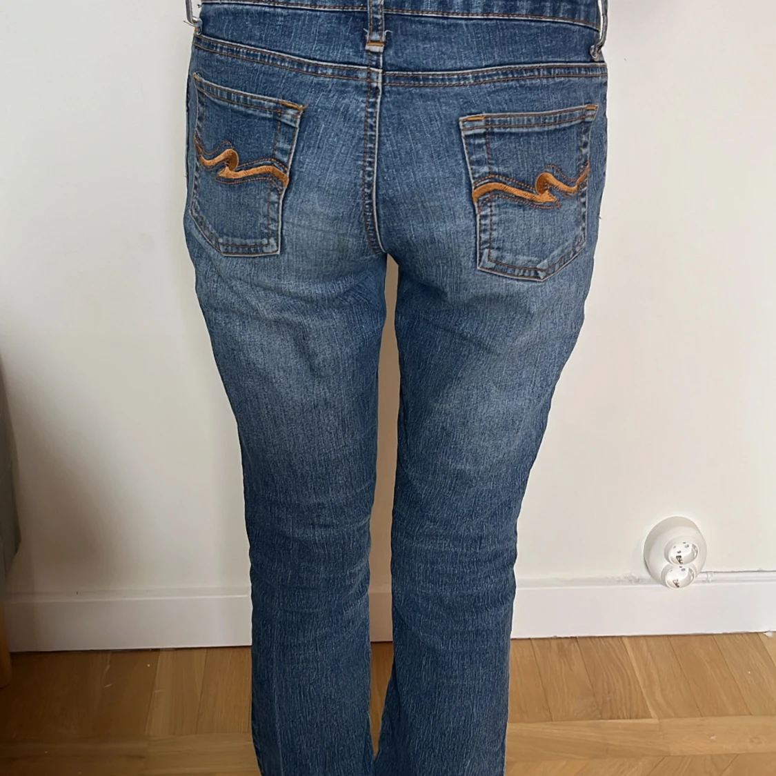 Snygga blå jeans med bootcut-snitt och låg midja. Jeansen har klassisk femficksdesign, orange kontrastsömmar och en broderad bakficka med vågigt mönster. Tillverkade i jeansmaterial med lätt tvättad look. Perfekta för en avslappnad stil.