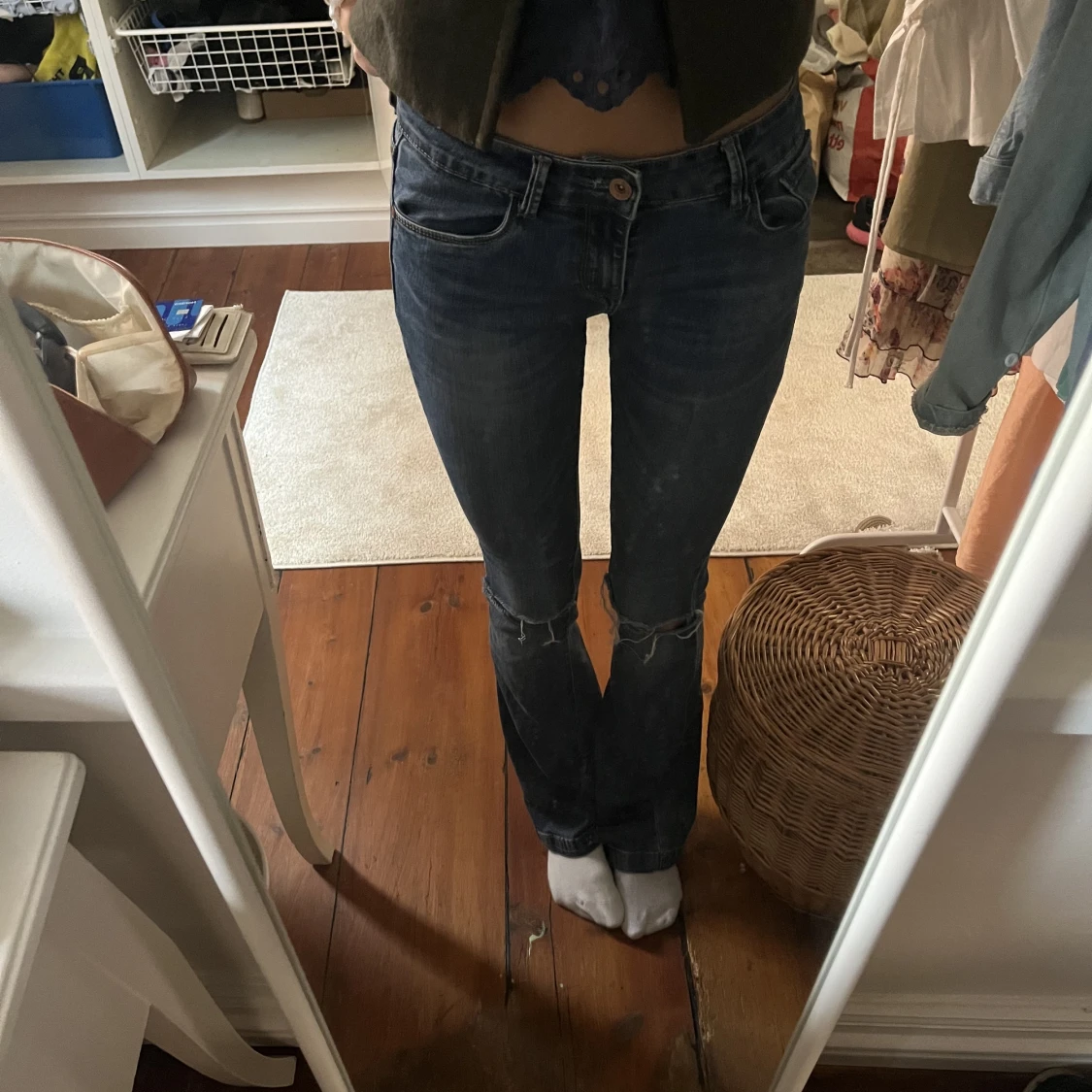 Lågmidjade utsvängda jeans med slitningar på knäna❤️ I bra skick. Jag är 173cm lång 💕