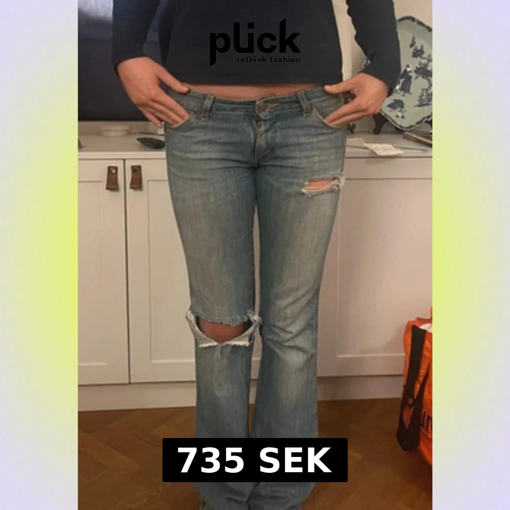 Snygga lågmidjade bootcut jeans med hål i från wrangler i storlek S !! Lånade bilder !!‼️‼️‼️skriv för egna !!