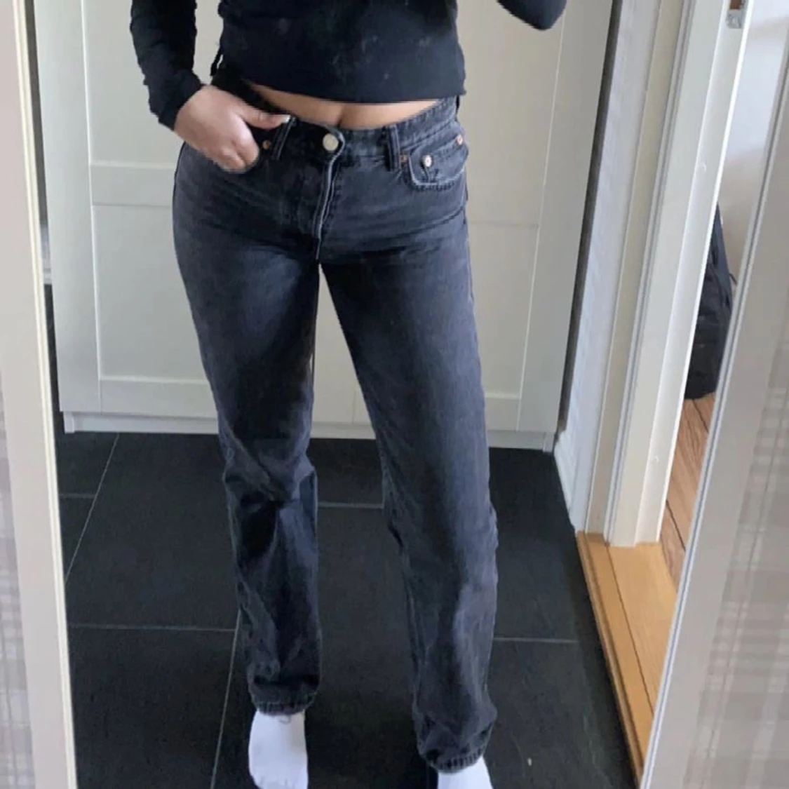 Säljer mina raka jeans från Zara då de har blivit försmå, de är i bra skick💞säljer även lika dana i mörkblå