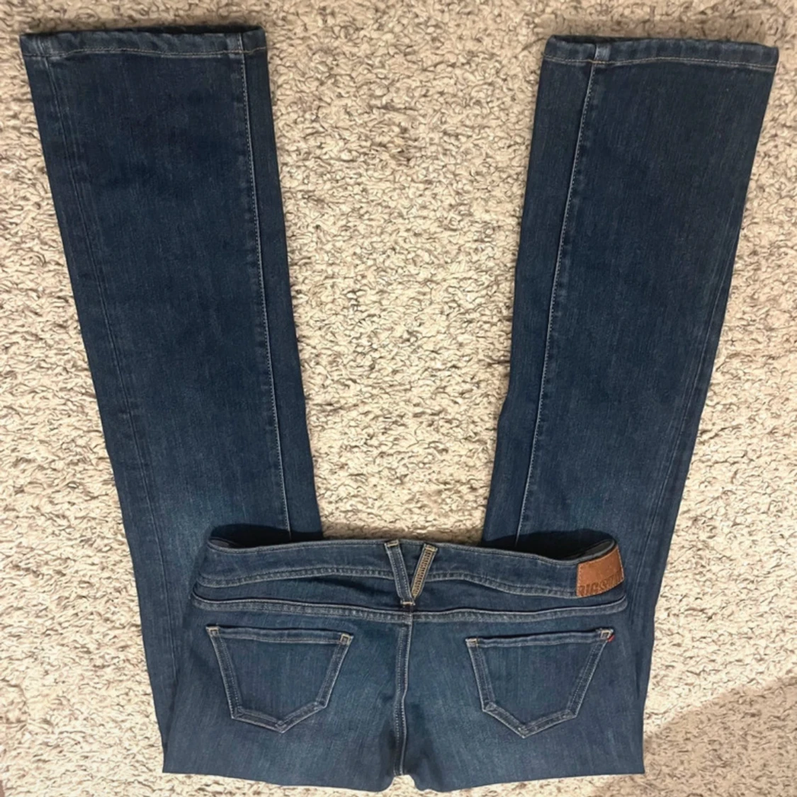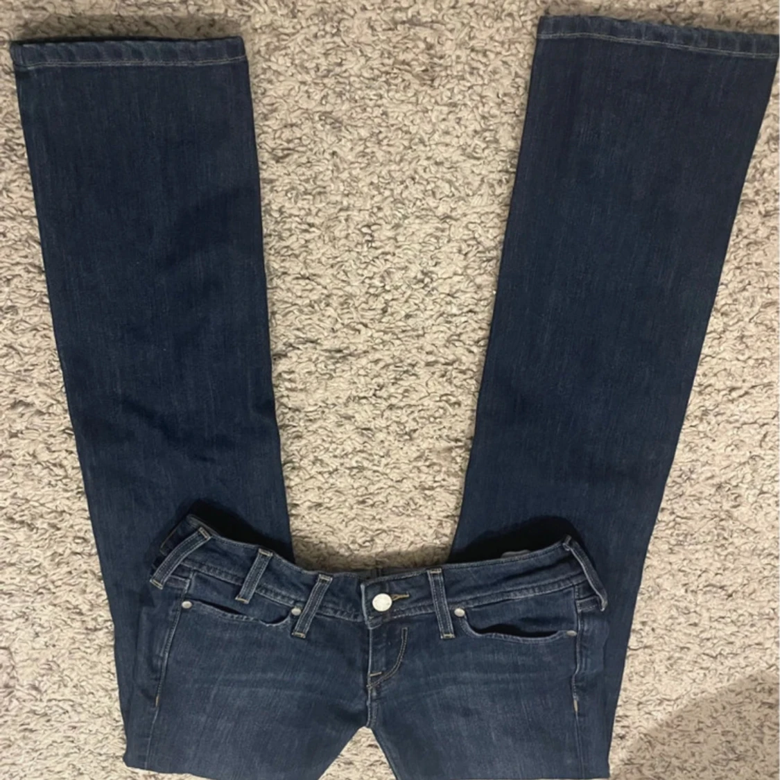Snygga mörkblå jeans💕 låg midjade och raka i benen med en lätt utsvängning. I väldigt fint skick. Innerbenslängd: 80cm Midja: 38cm