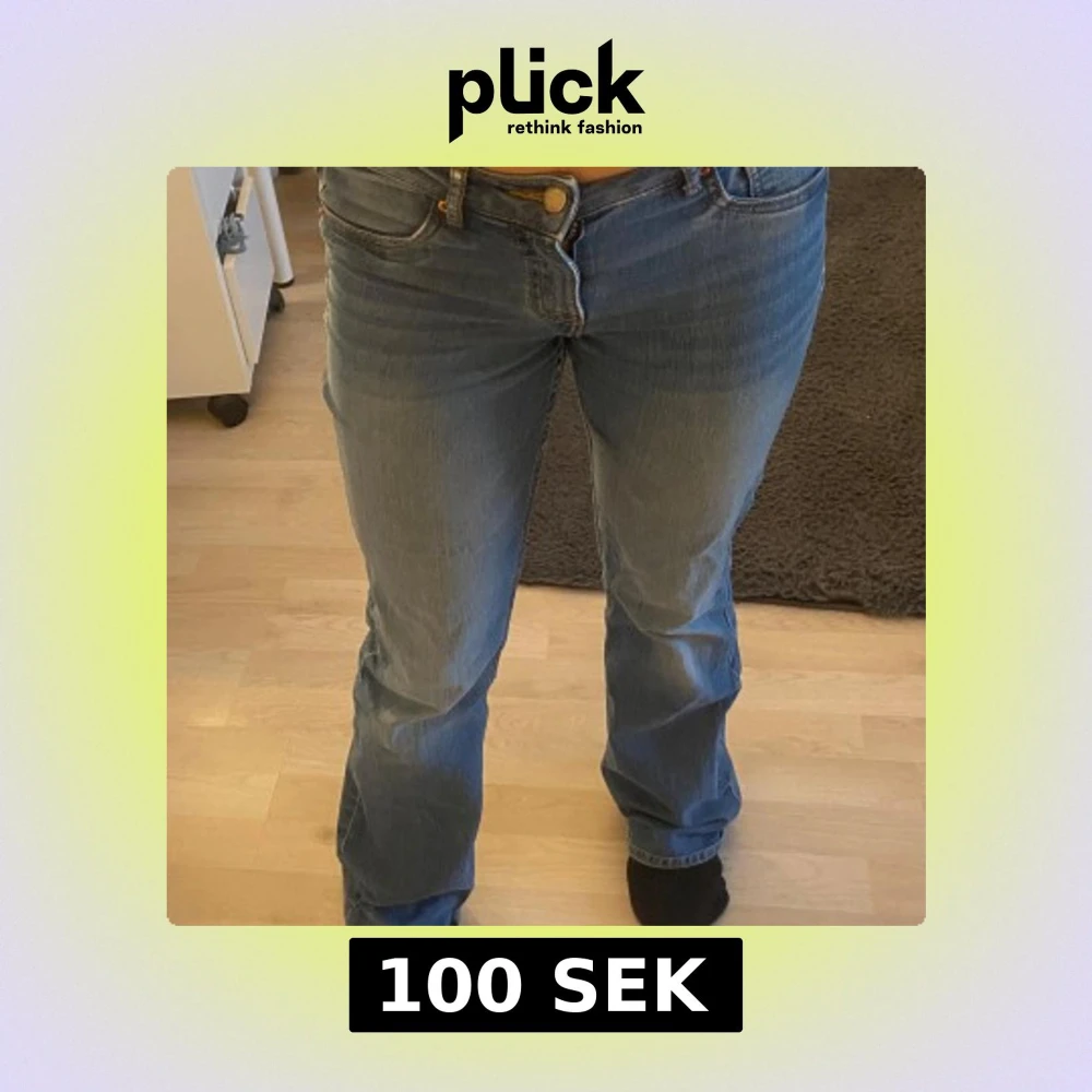 Säljer ett par klassiska blå bootcut jeans med normal passform. Jeansen har fem fickor, dragkedja och knapp framtill. De är tillverkade i denim och har en lätt tvättad look med ljusare partier framtill och baktill.