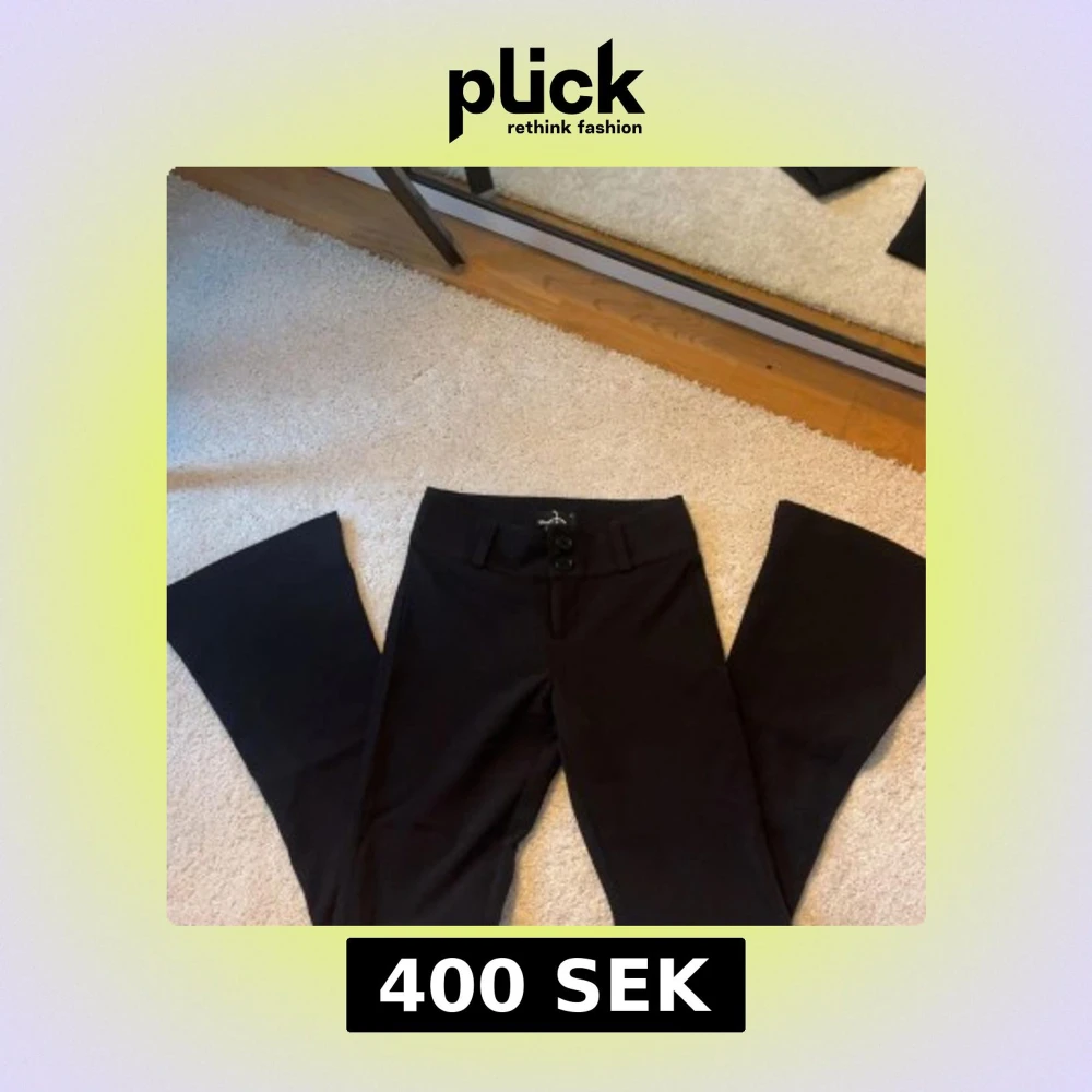 Säljer ett par svarta lågmidjade kostymbyxor i bootcut-modell med två knappar framtill och fickor med lock bak. Byxorna har en klassisk look och är perfekta för en stilren outfit. Aldrig använt dessa byxor då dem är för små.