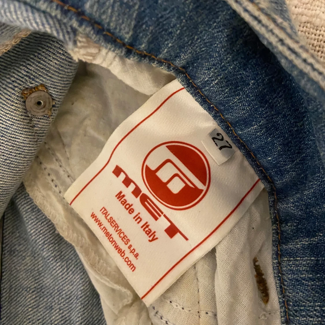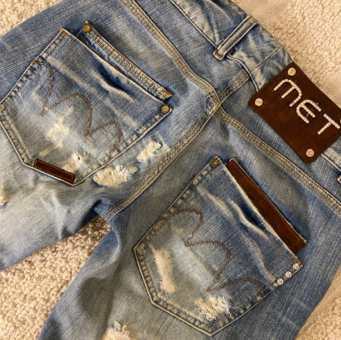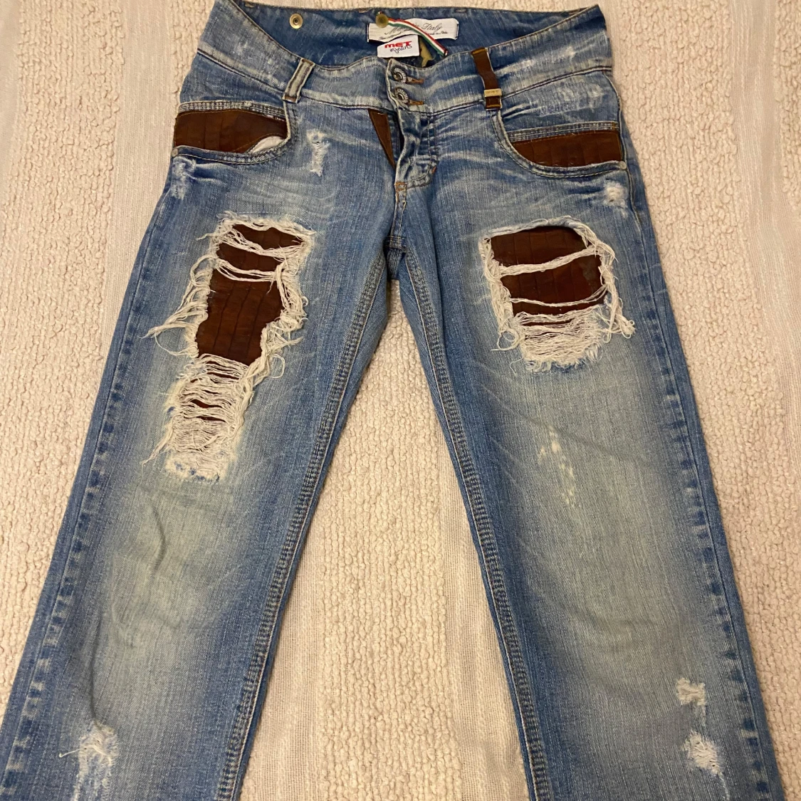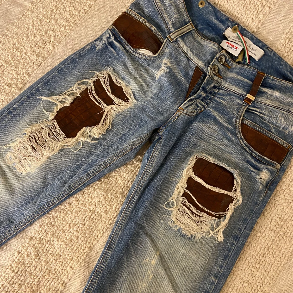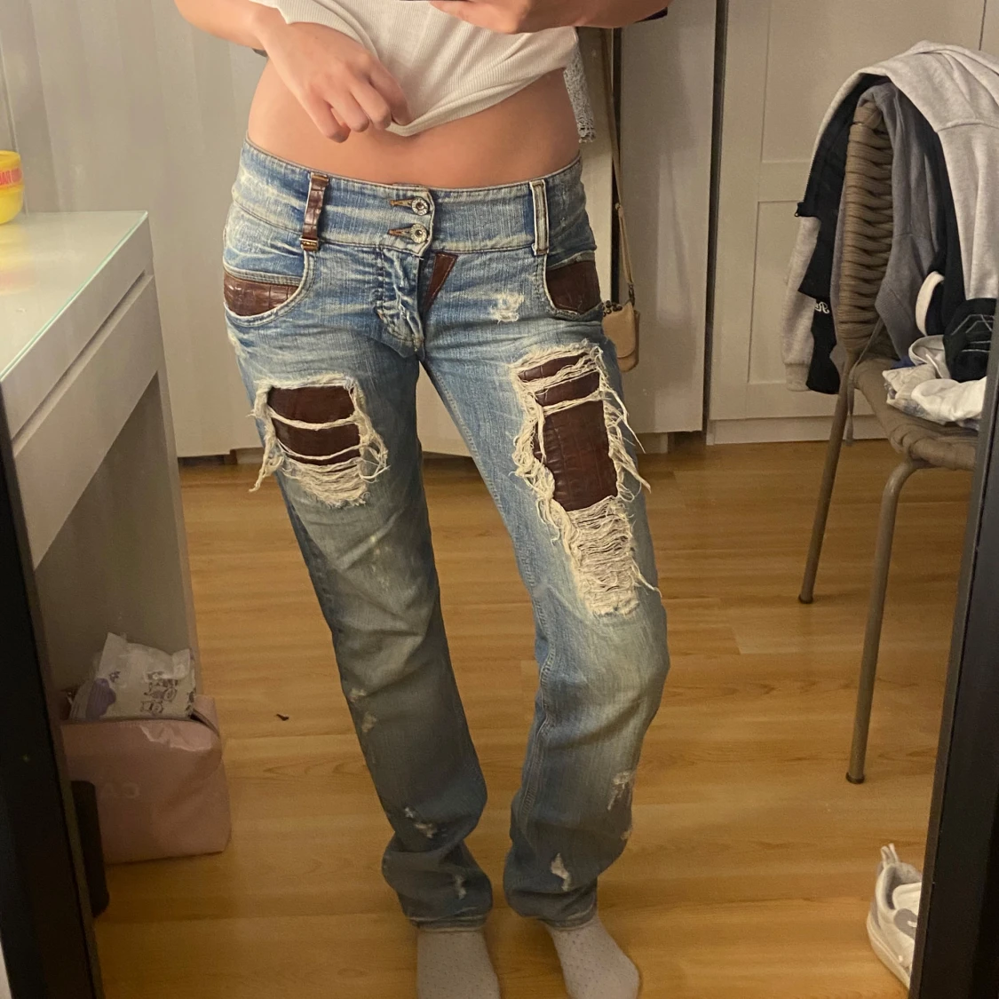 Säljer ett par ljusblå jeans med bruna detaljer och stora slitningar framtill. Jeansen har raka ben och bruna lappar vid fickor och lår. Snygga kontrastsömmar och cool vintagekänsla.