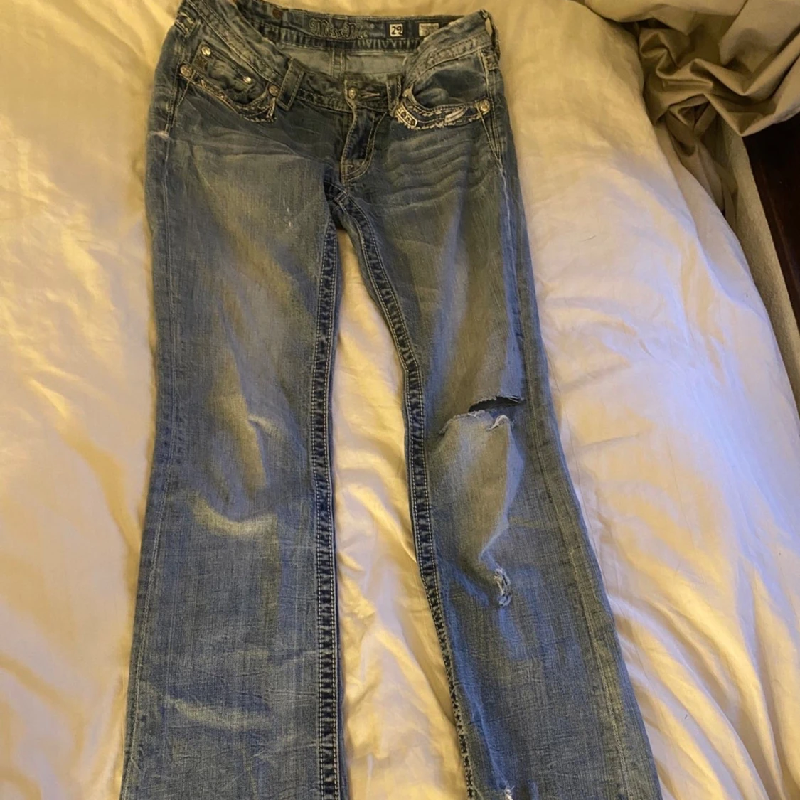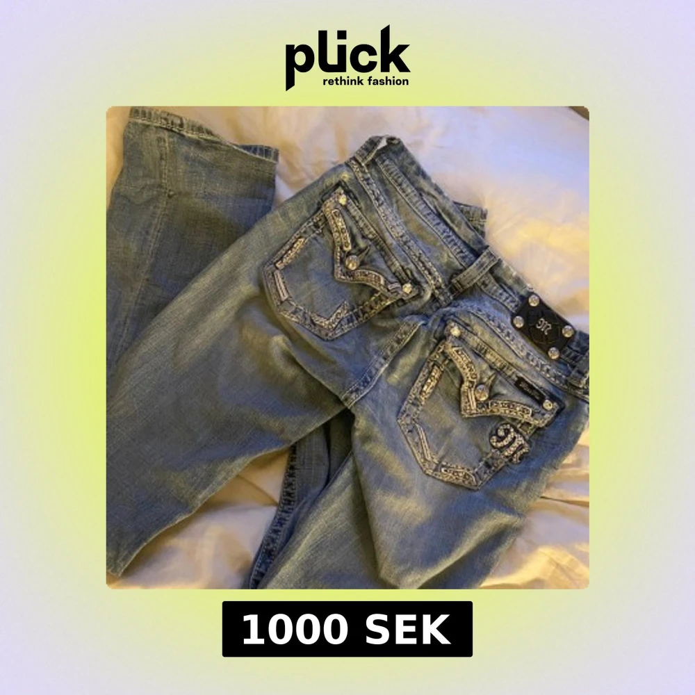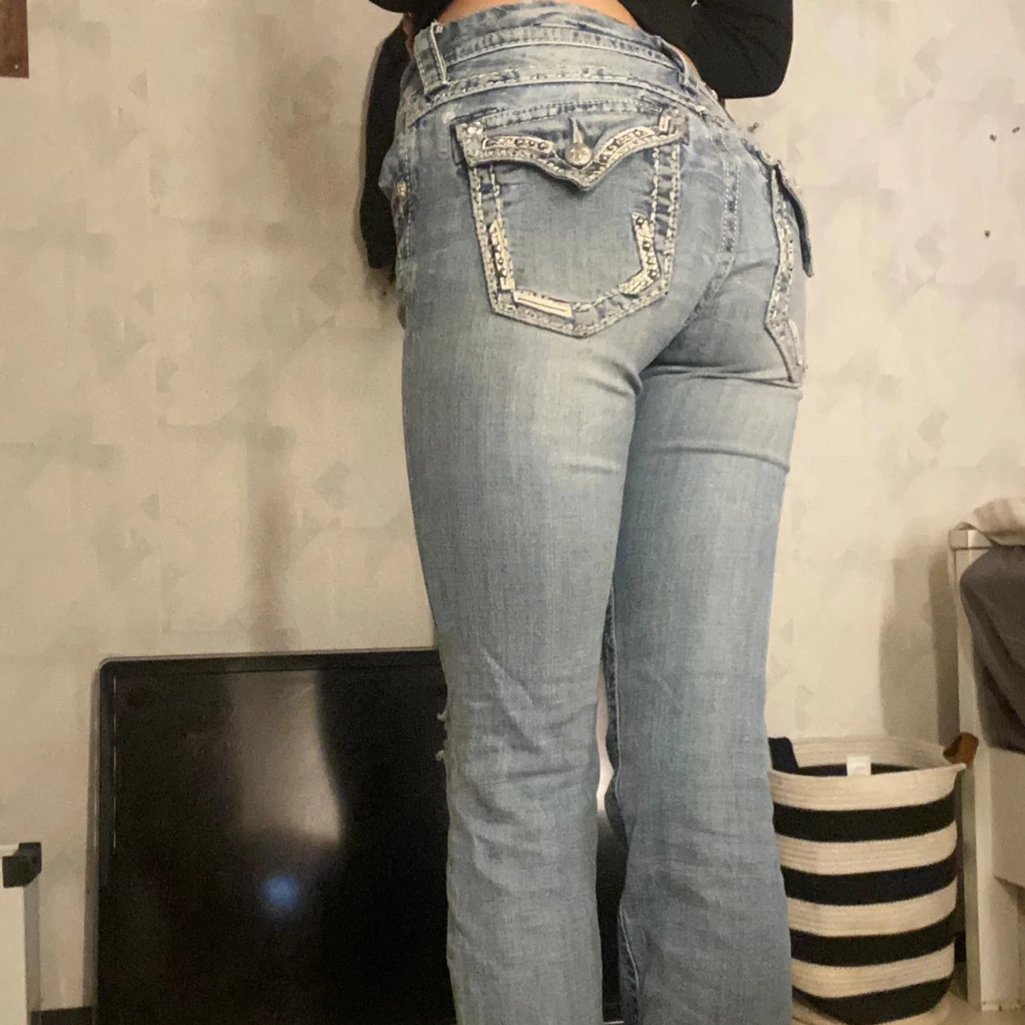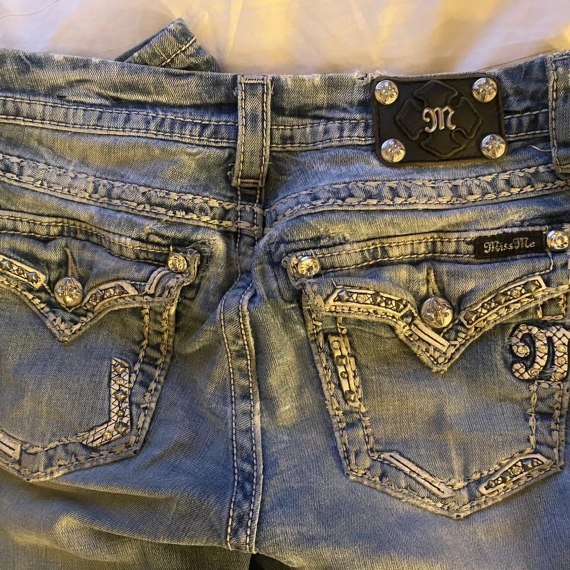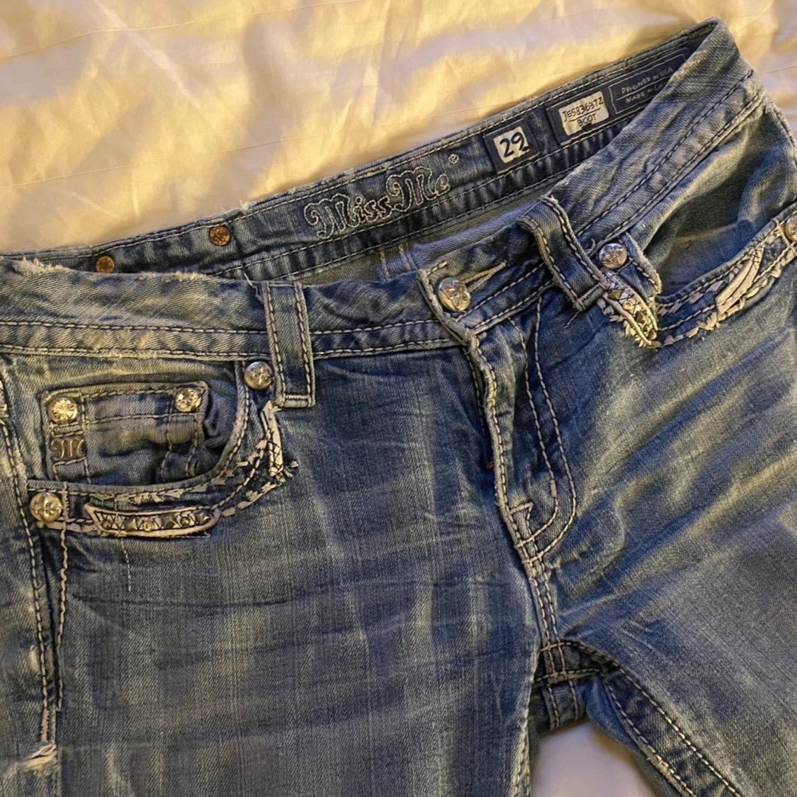 Säljer ett par ljusblå jeans med bootcut från Miss Me med snygga detaljer och bling på bakfickorna. Jeansen har bootcut stil och coola broderier samt nitar och stenar på fickorna. Klassisk femficksmodell med låg midja och dragkedja. Storleken är 29, de är använda ett fåtal gånger så de är i väldigt fint skick!❤️Köptes för 1299 kr😌