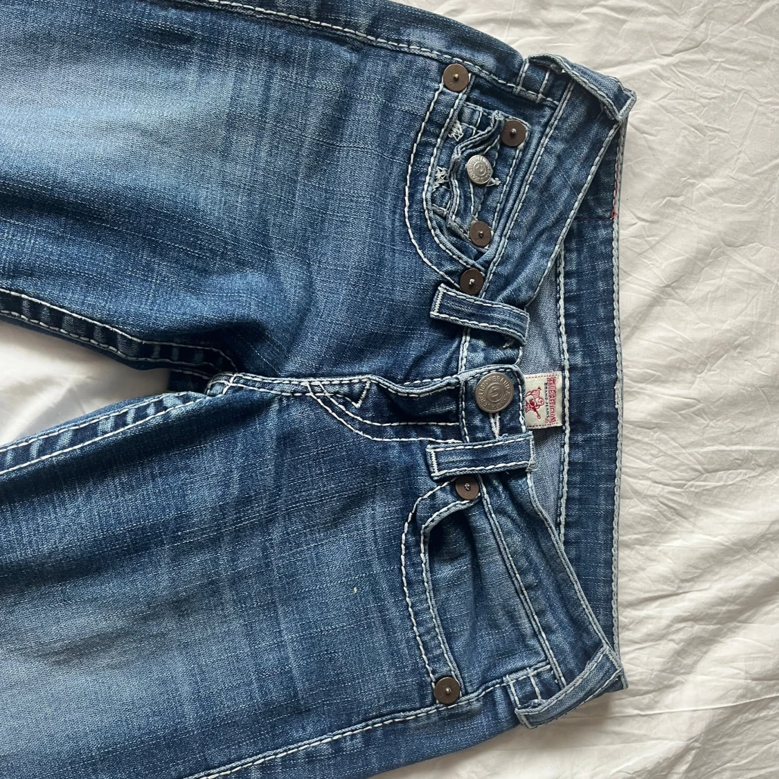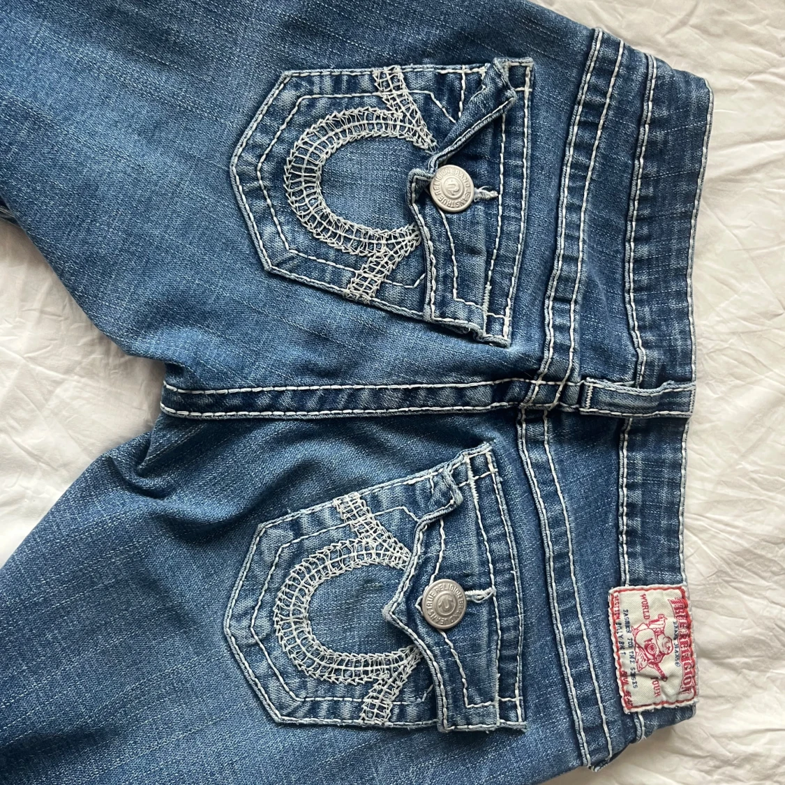 Säljer dessa skit snygga jeans från true religion😍 De är lågmidjade och har broderade bakfickor. Inga defekter.💕De är i storlek 26. Skriv gärna till mig vid frågor eller fler bilder💞💞(pris kan diskuteras)