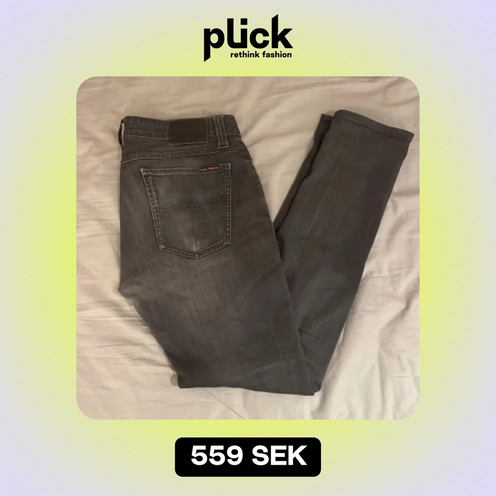 Nudie jeans i en väldigt snygg tvättad svart färg. Skick: 6,5 då de har ett hål på knät men som ändå gör jeansen lite snyggare! Nypris: 1600kr. Killen på bilden är 182cm lång. OBS är öppen för byten!