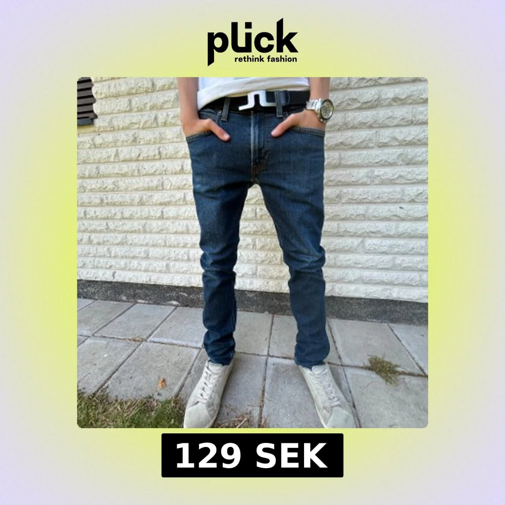 Snygga mörkblå jeans från Lee i klassisk skinny fit. Jeansen har fem fickor, bruna kontrastsömmar och Lee-logga på bakfickan. Tillverkade i mjukt denim med lite stretch för extra komfort. Perfekta till sneakers och t-shirt för en clean look. Små hål där fram (se bild 5). Priset är ej hugget i sten!