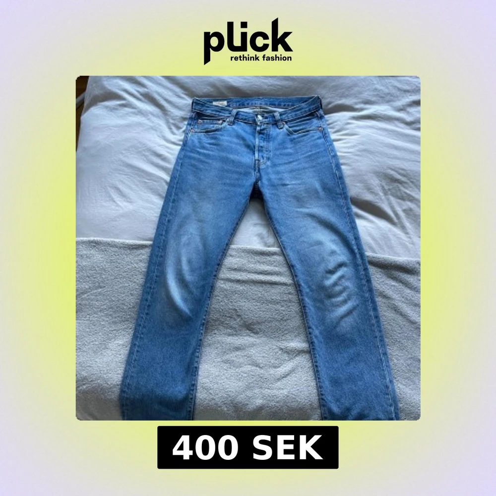 Säljer ett par klassiska Levi's 501 jeans i ljusblå tvätt. De har rak passform, normal midja och fem fickor. Jeansen är i 100% bomull och har den ikoniska läderpatchen bak. Perfekta för en avslappnad och tidlös stil.