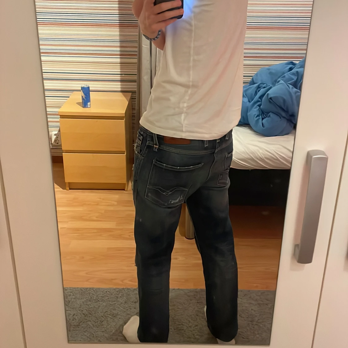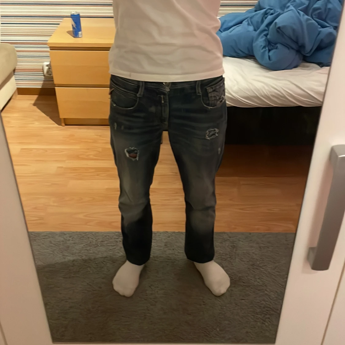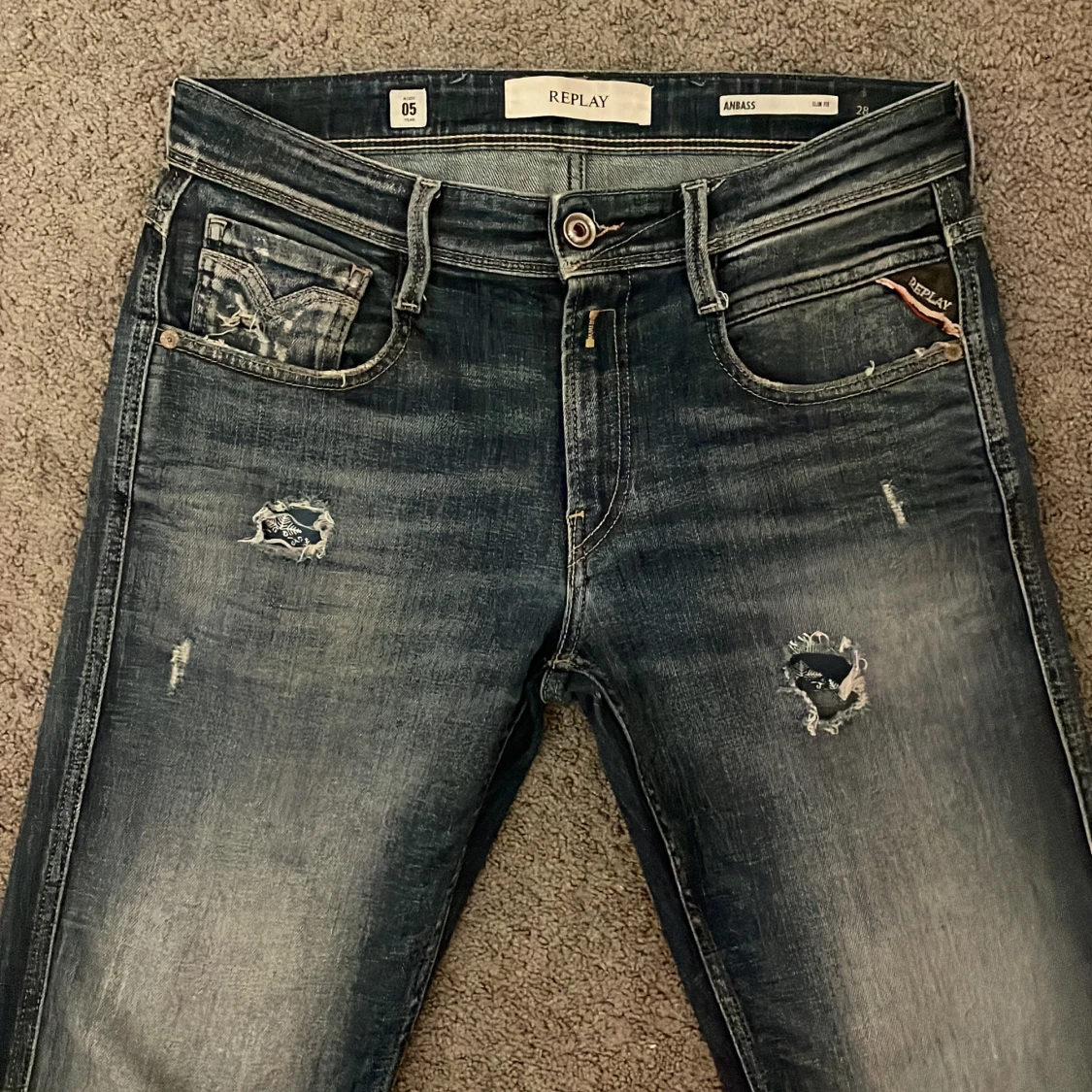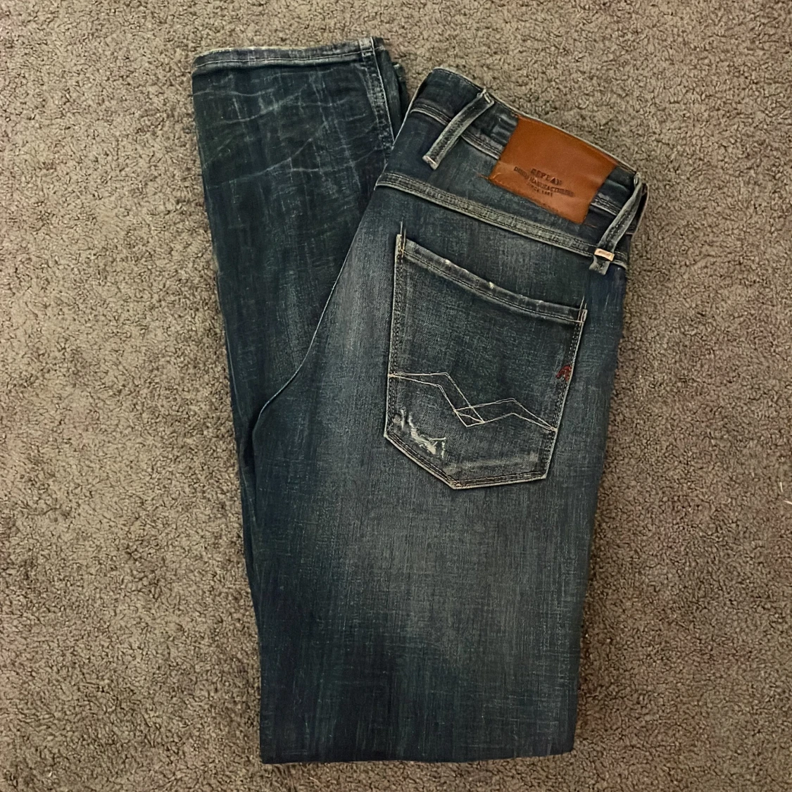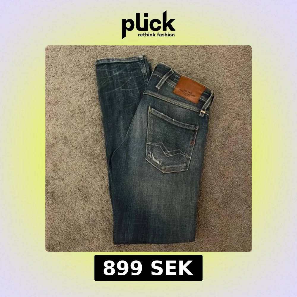 Säljer ett par riktigt snygga replay anbass jeans med slitningar perfekta för sommaren. Storlek W28 L32 perfekt för dig som är runt 175-185, jeansen är i nyskick aldrig använda endast använda på bilderna. Vid frågor eller funderingar meddela mig, pris kan diskuteras vid snabba affärer.
