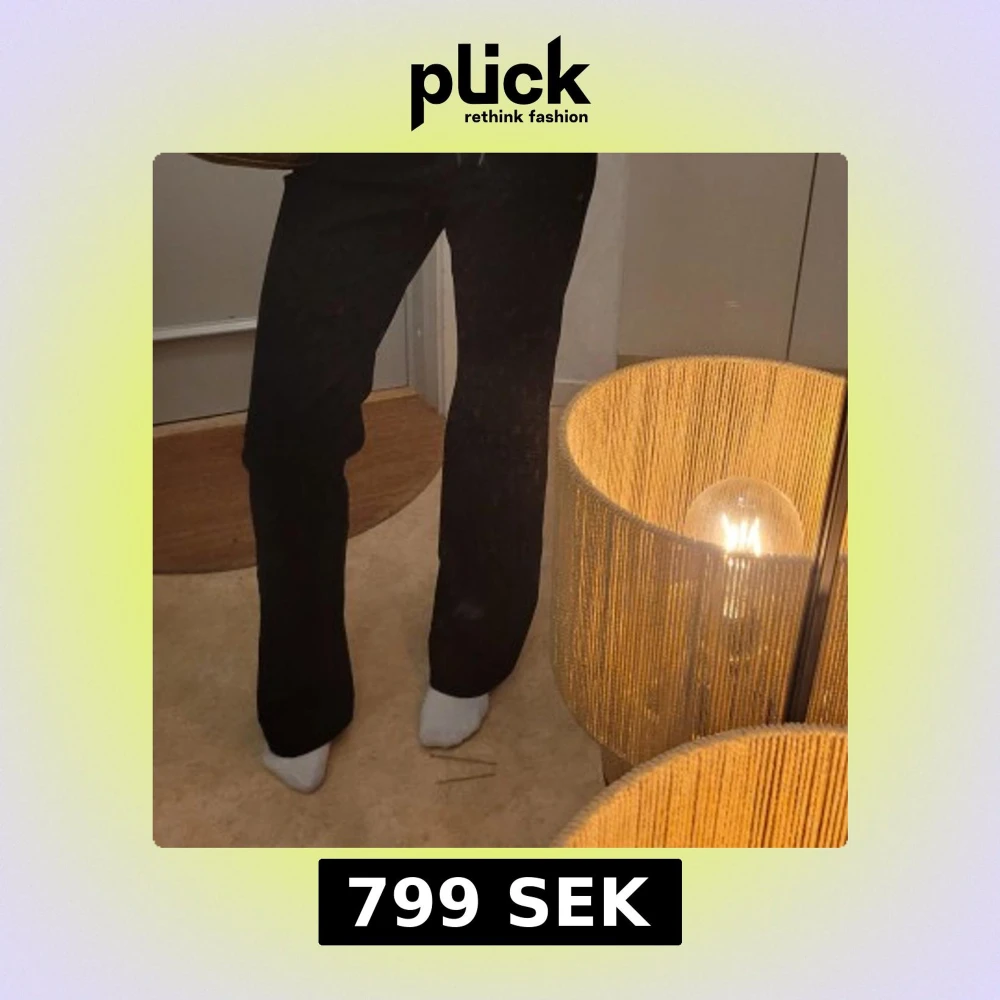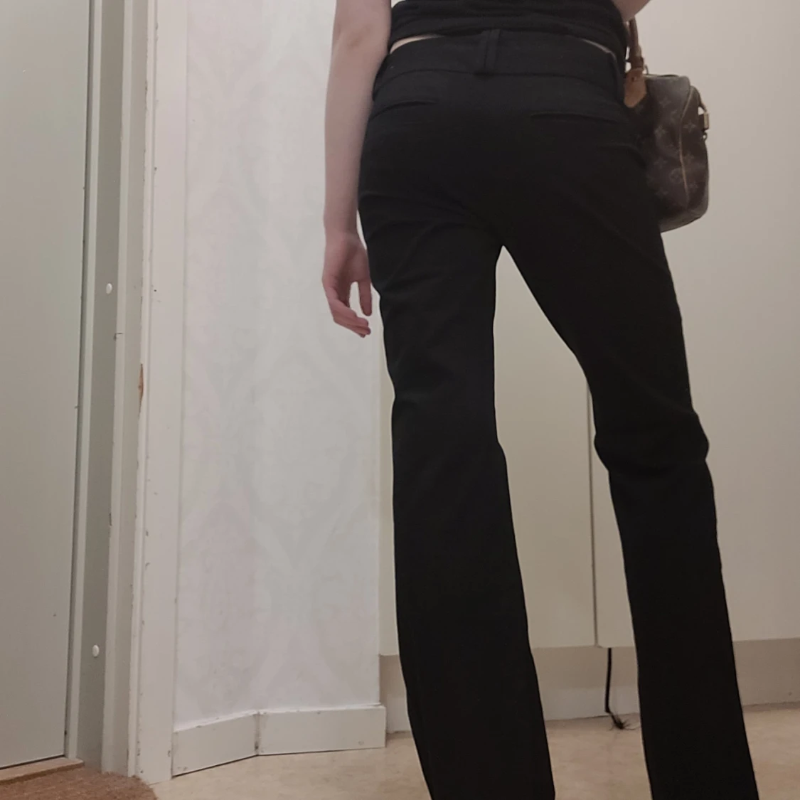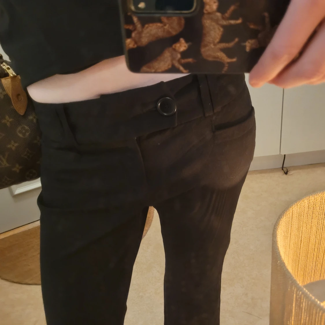 Snygga svarta kostymbyxor med låg midja och bootcut-stil. Byxorna har en stilren design med knappar framtill och passar perfekt för en chic look. Byxorna har extra långa ben och är lite långa på mig som är 173! 1400💕💕