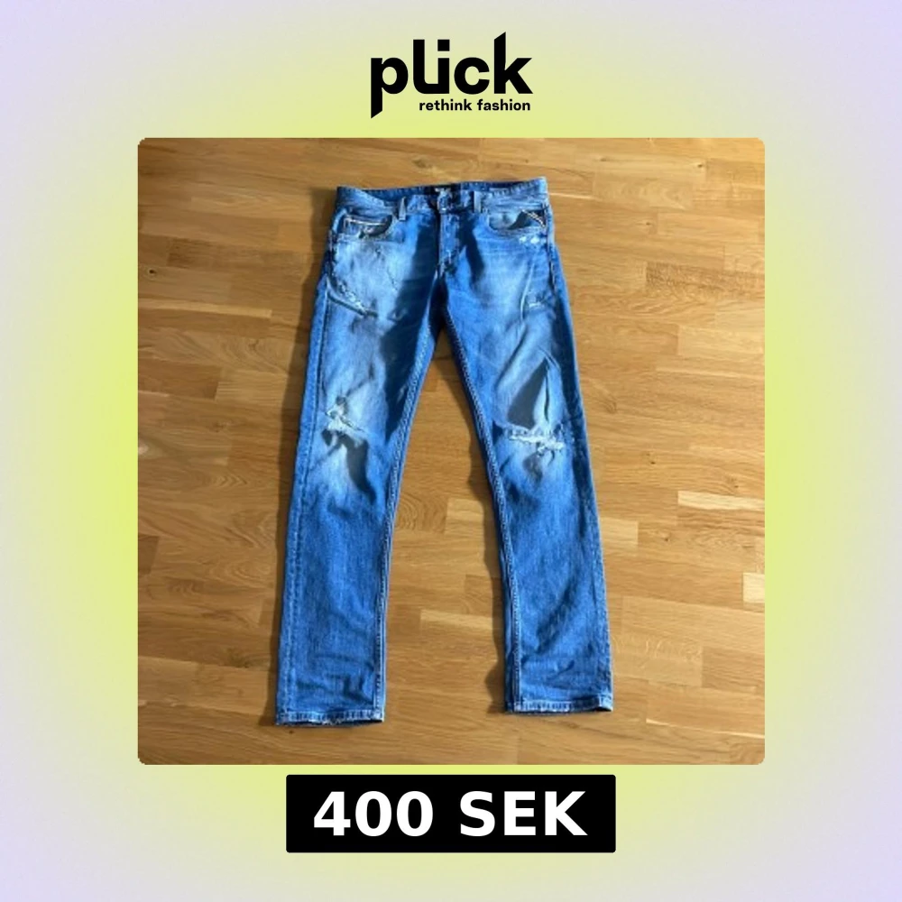 Säljer ett par blå jeans från Replay Grover med slitningar. Klassisk femficksmodell med normal passform och raka ben. Perfekta för en laidback stil.