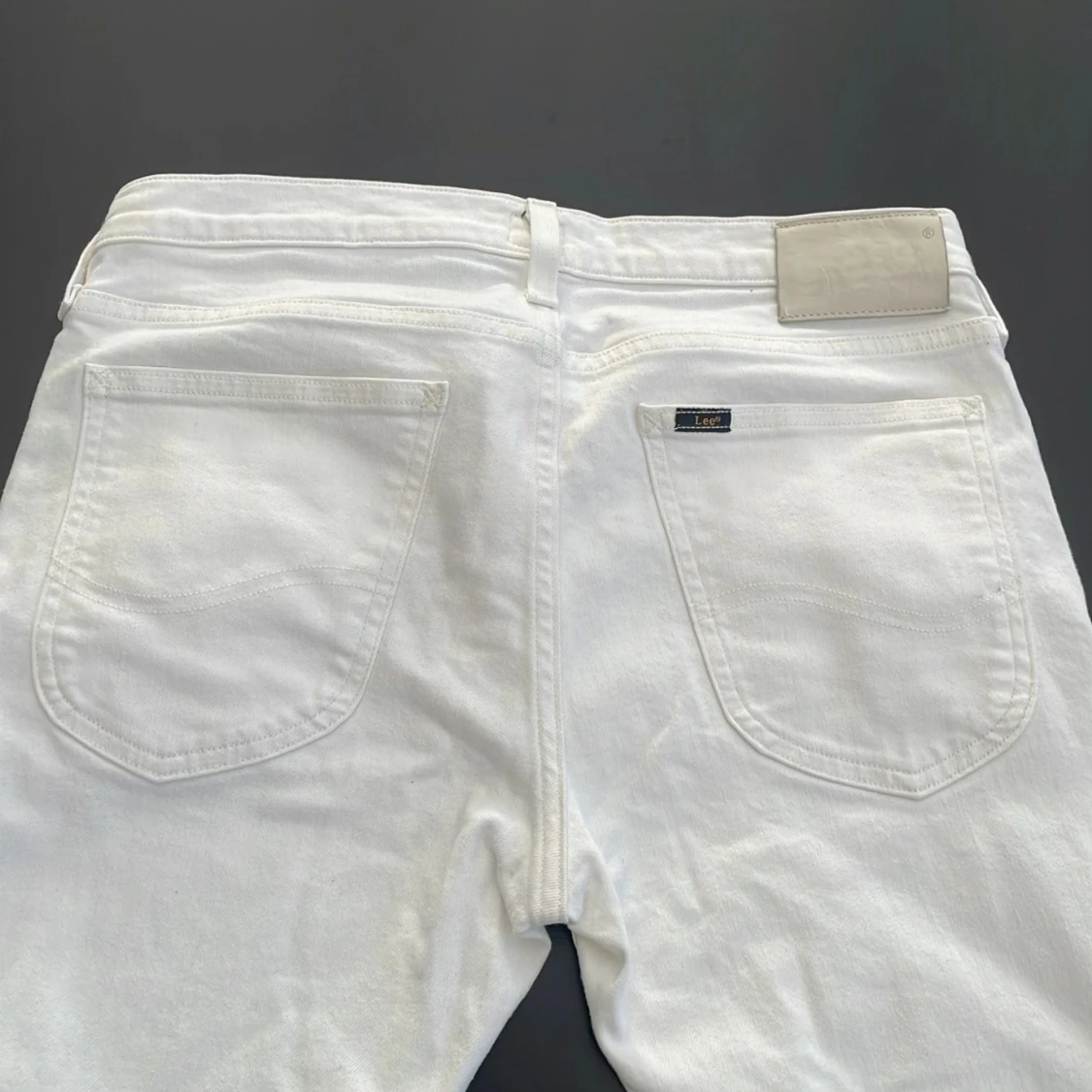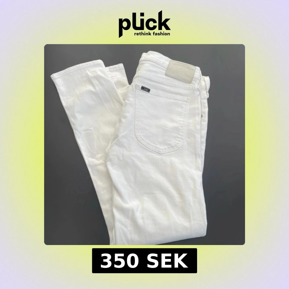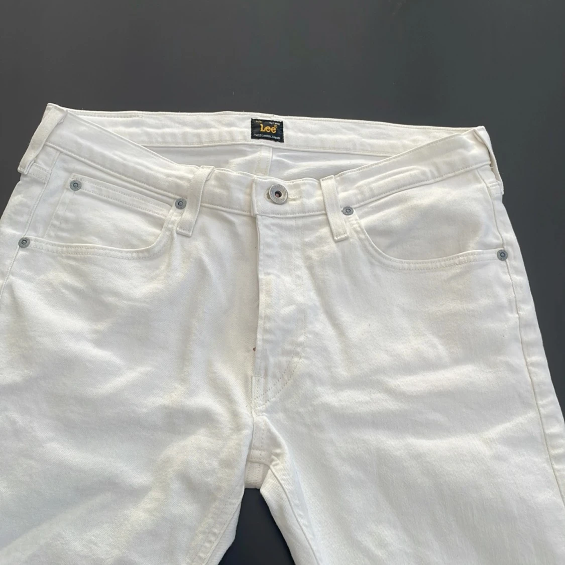 Säljer ett par klassiska vita jeans från Lee med fem fickor och silverfärgade nitar. Byxorna har normal passform och raka ben. Perfekta för en stilren look och lätta att matcha med olika outfits.