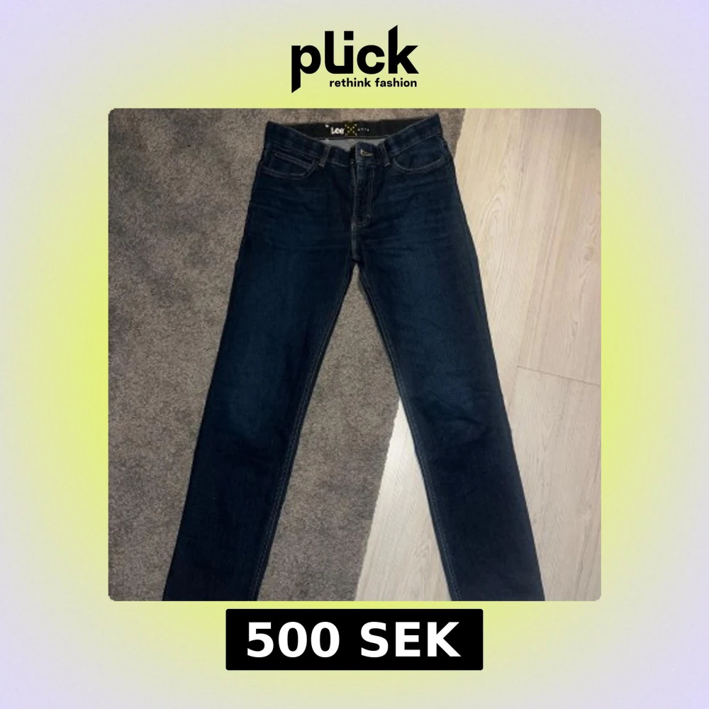 Snygga mörkblå jeans från Lee med klassisk femficksdesign och knappgylf. De har en rak passform och är perfekta för en avslappnad stil. Lee-loggan syns tydligt på baksidan av midjan knappt använda. 31/32