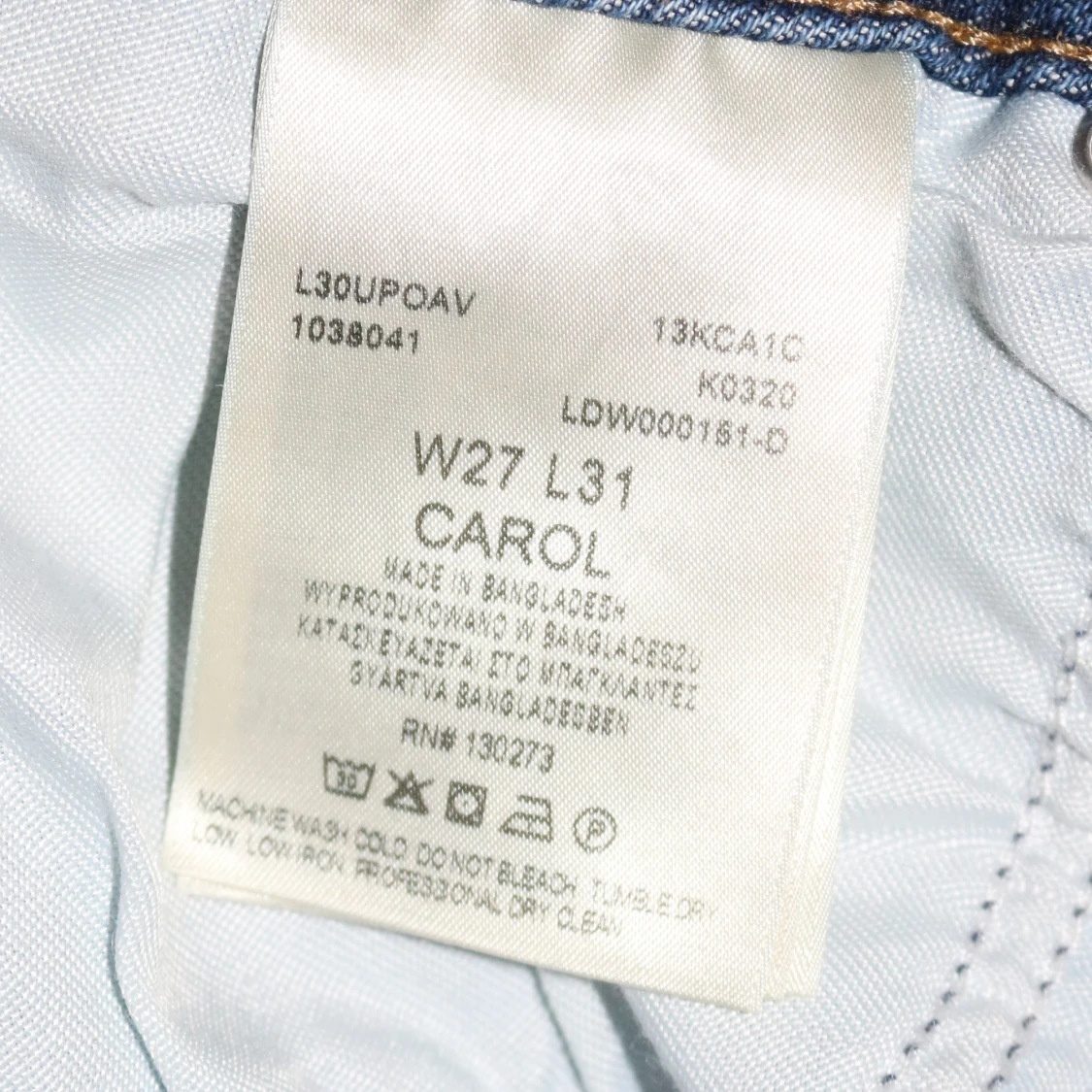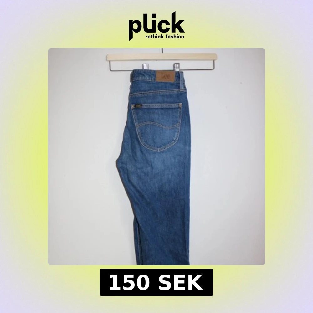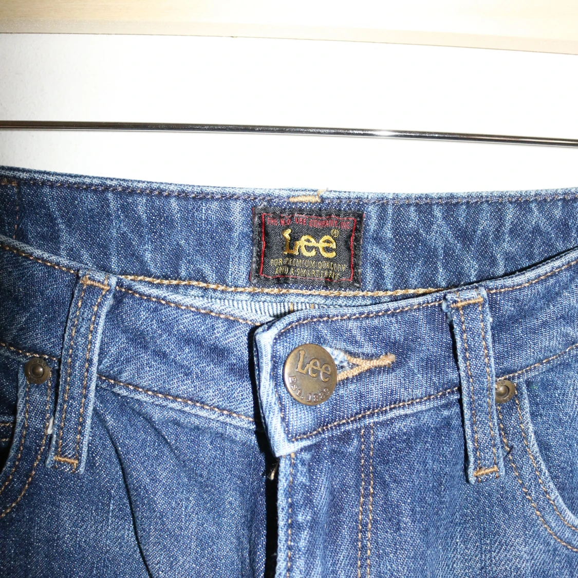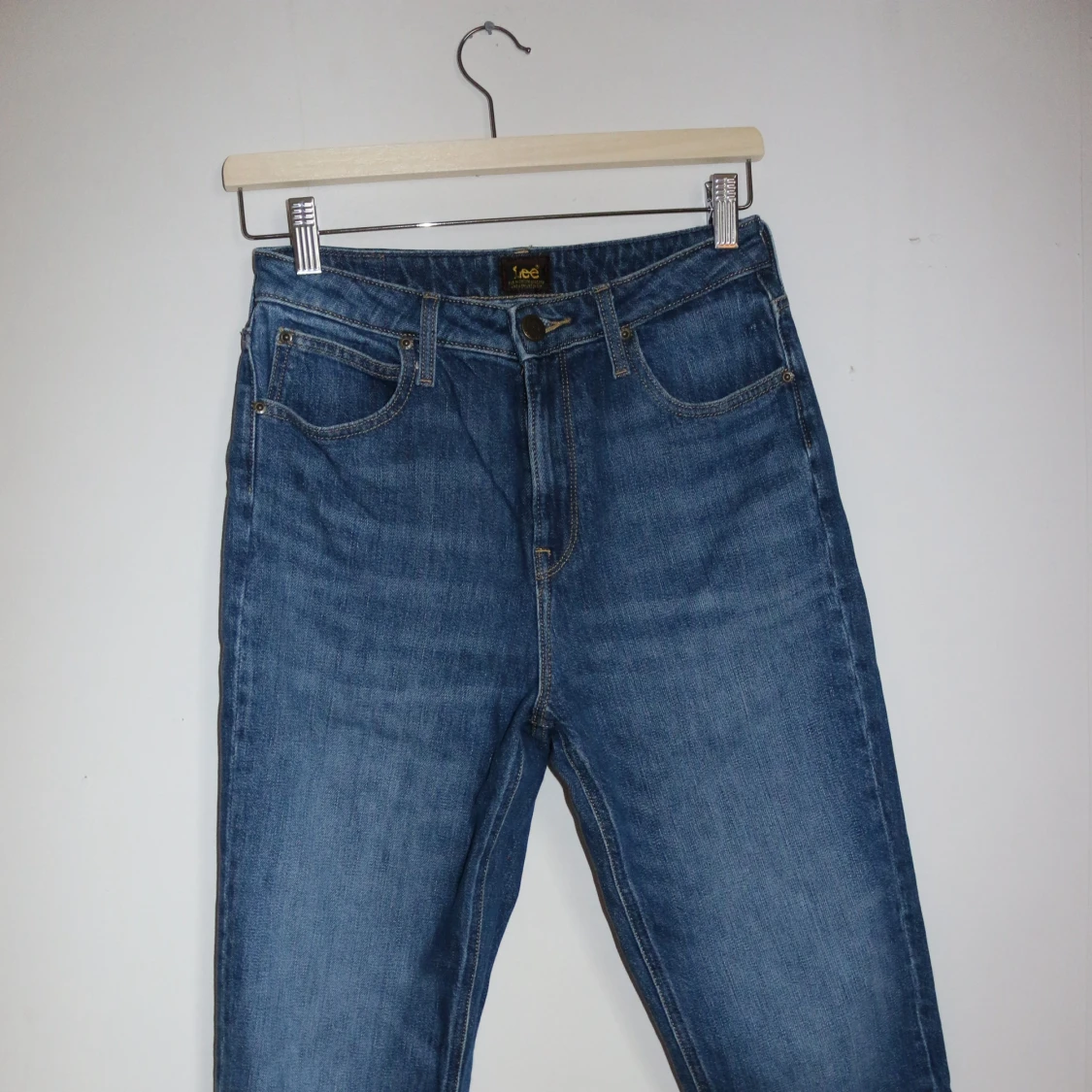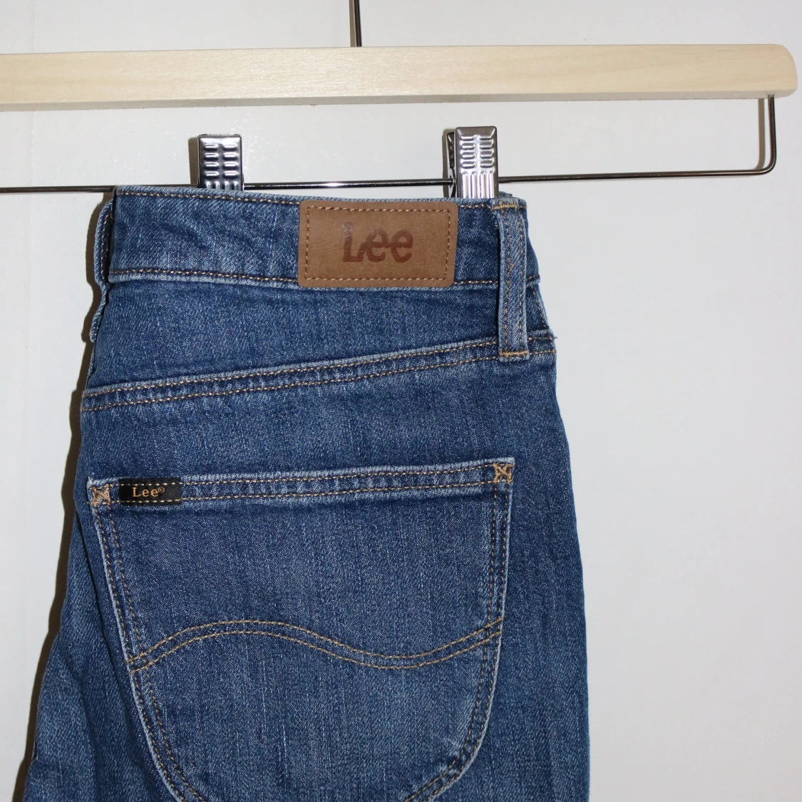 Snygga blå jeans från Lee med klassisk femficksdesign och hög midja. Jeansen har raka ben och Lee-logga på bakfickan samt läderpatch i midjan. Fint skick, inga skavanker. True to size.
