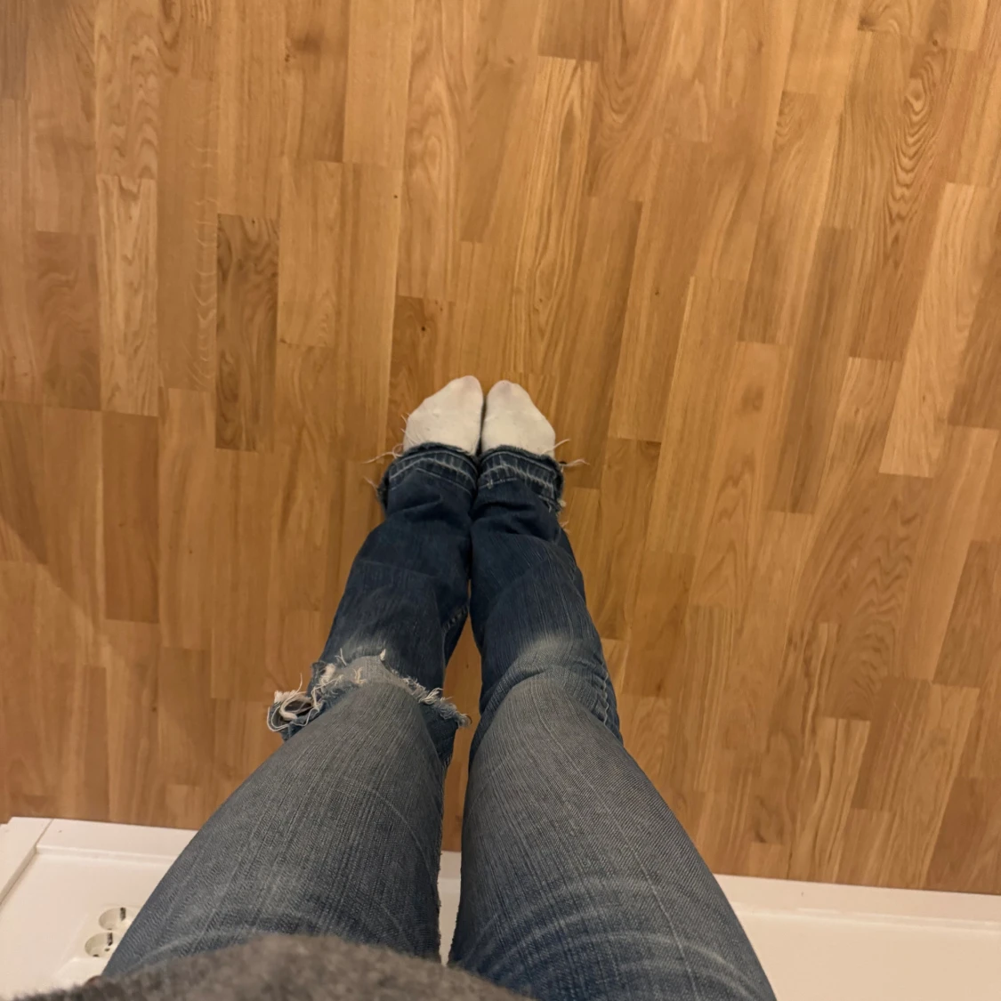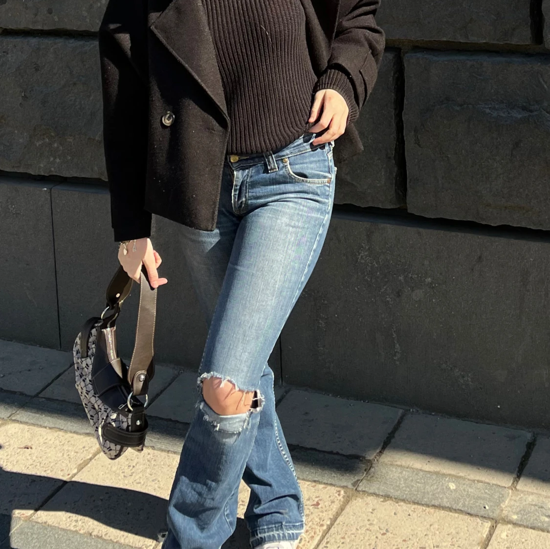 Snygga blå jeans med bootcut passform och slitningar vid knäet och benslut. Jeansen har klassisk femficksdesign, låg midja och är tillverkade i jeansmaterial. Perfekta för en avslappnad och trendig look.