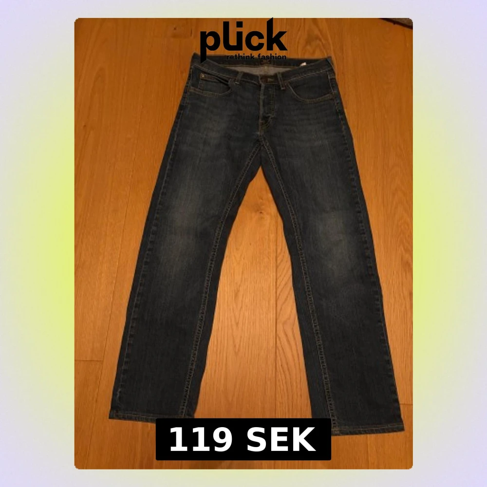 Säljer ett par klassiska Lee jeans i mörkblå tvätt med raka ben och knappgylf. Jeansen har fem fickor, kontrastsömmar och är tillverkade i slitstarkt bomullsjeansmaterial. Perfekt för dig som gillar tidlös och enkel stil.