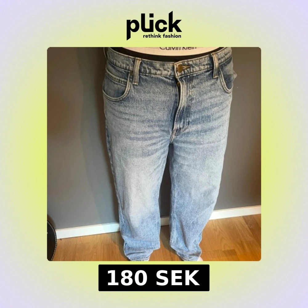 Säljer ett par ljusblå jeans från Lee med klassisk femficksdesign och tydlig stentvättad look. Jeansen har en baggy passform och raka ben, med Lee-lappen bak i midjan. Perfekt för dig som gillar retrostil och avslappnad vibe.