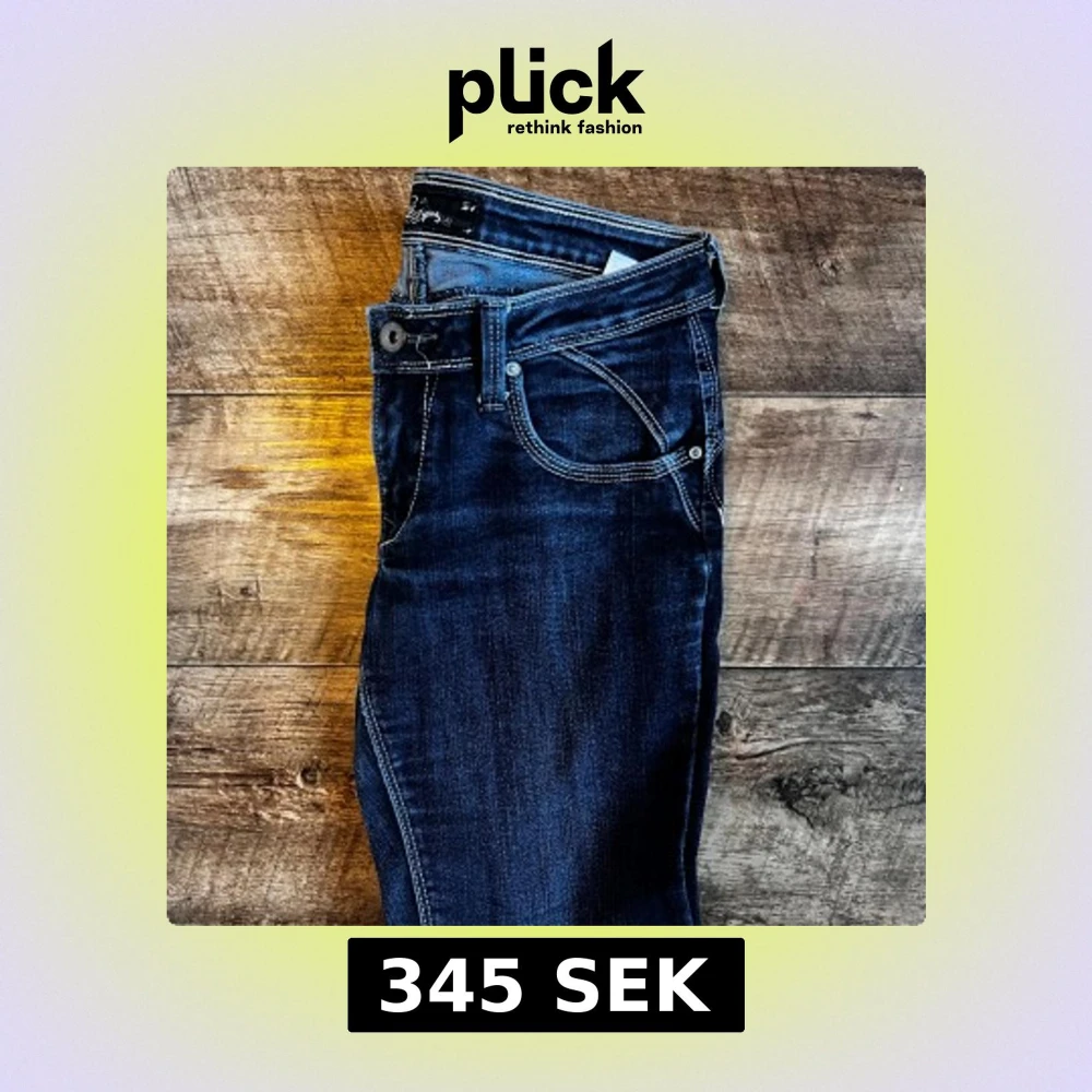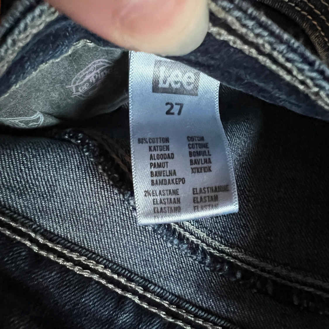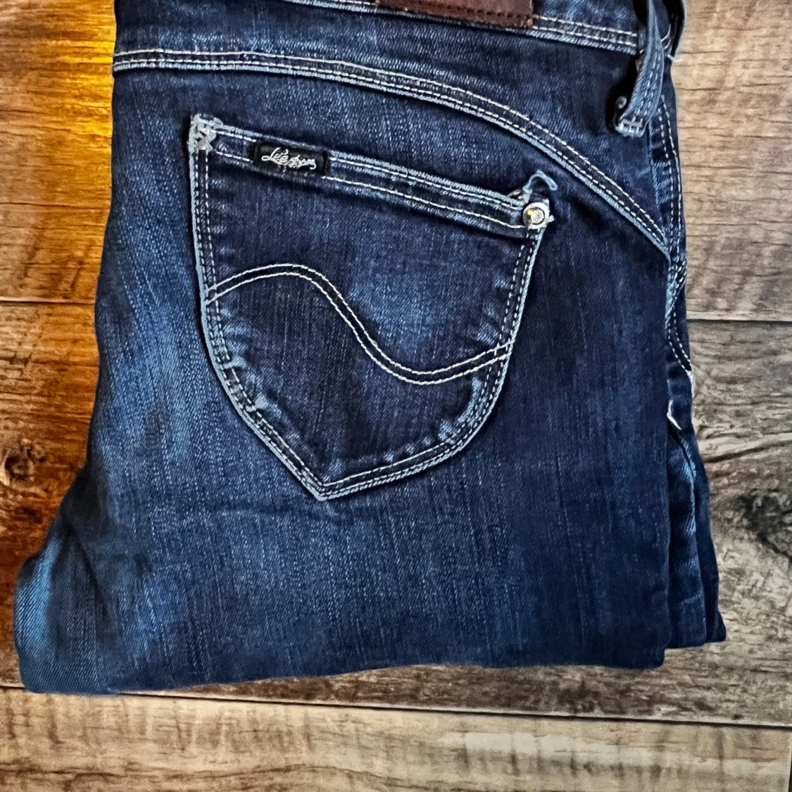Snygga mörkblå jeansbyxor från Lee. Byxorna har låg midja och är tillverkade i bomull med lite elastan för extra komfort. Perfekta för en avslappnad och trendig look. Mycket fint skick.