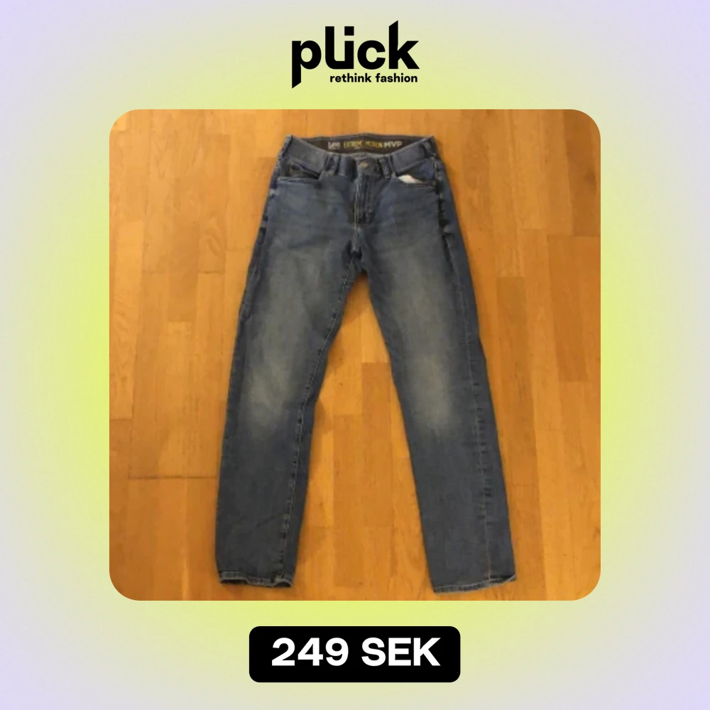 Ett par blå jeans från Lee's Performance Series, modell Extreme Motion MVP. De har en klassisk femficksdesign och en läderpatch med Lee-logotypen på baksidan. Byxorna har passformen straight Fit Tapered Leg.