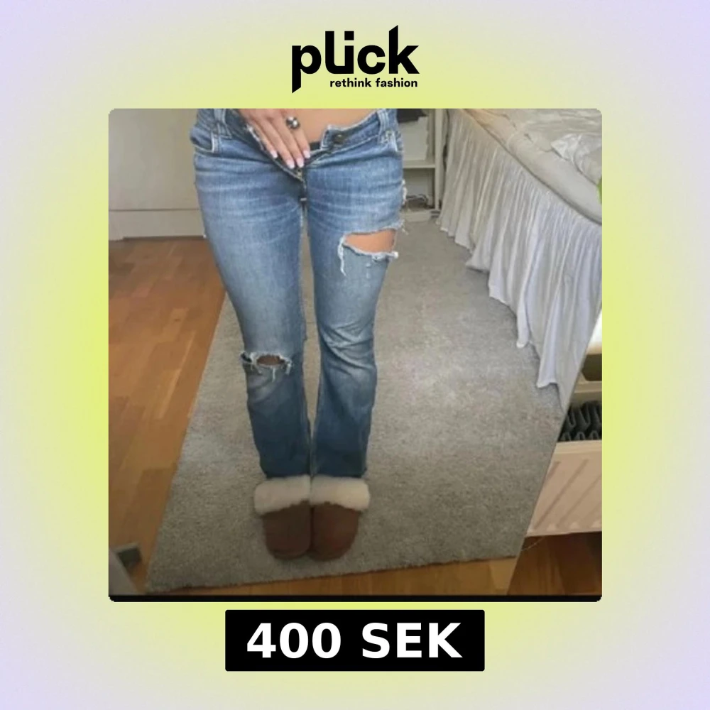 Blå low waist jeans med revor från Lee. Midjemått = ca 37 cm, innerbenslängd = ca 74-75 cm.