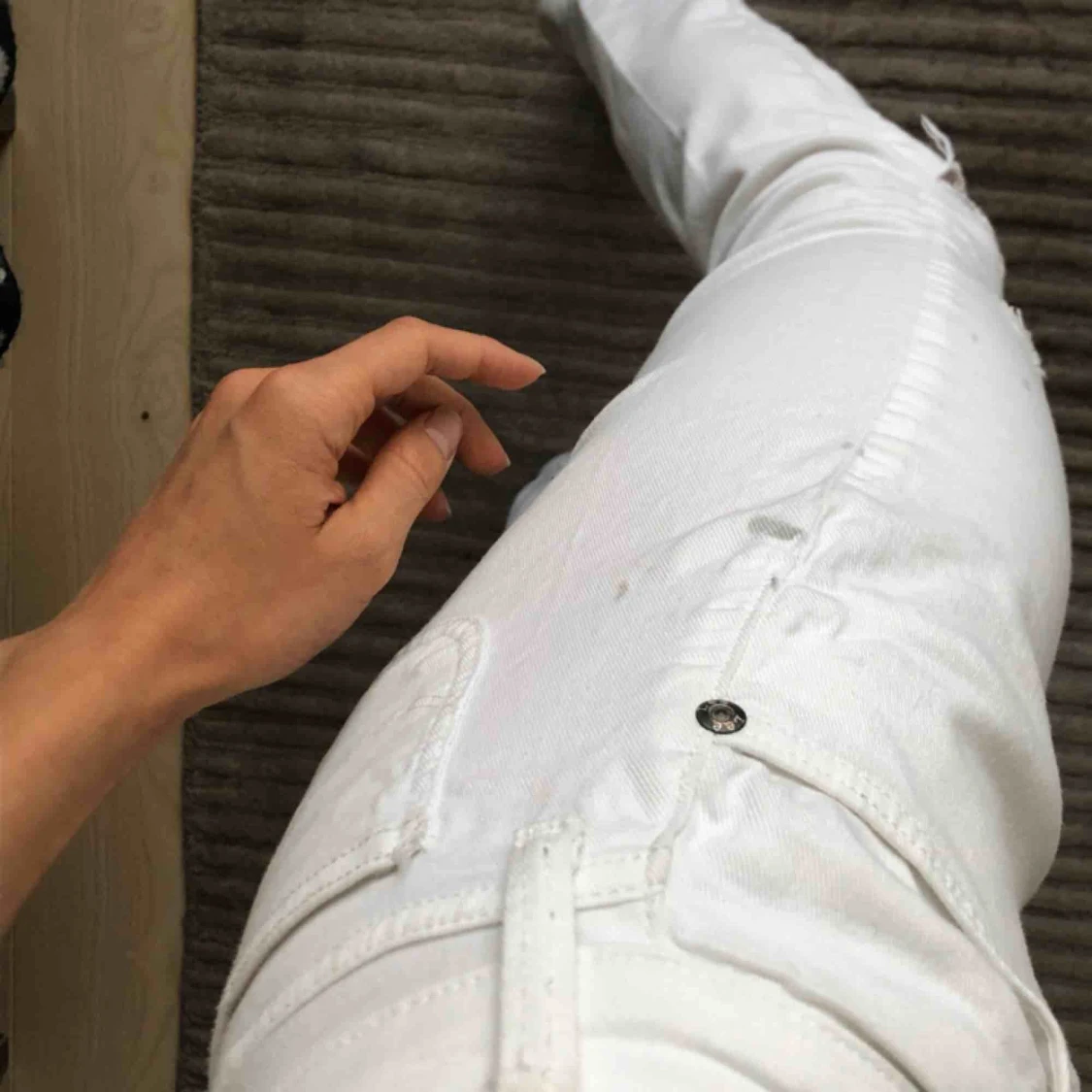 Snygga LEE jeans som tyvärr inte kommer till användning. Lite tvättskadade och har några svarta märken som inte går att tvätta bort, -> därav det låga priset. Super coola annars! Märkena och skadorna läggs inte stort märke till då de är ”ripped jeans”.