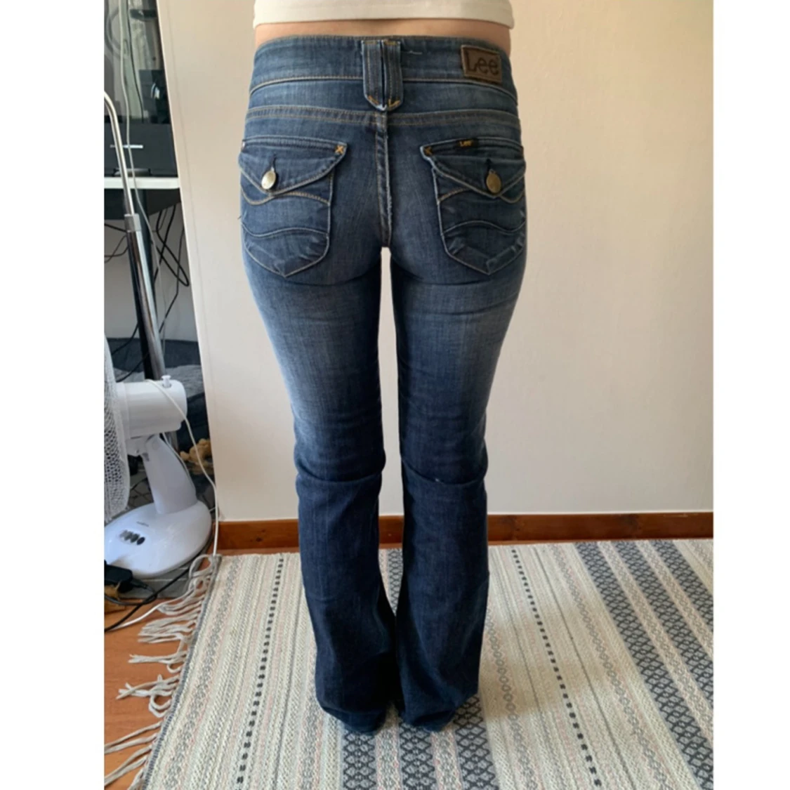 Säljer dessa vintage low rise lee jeans i strlWw26 L36. Skulle säga att den sitter som xxs. Min kompis på bilden är 159 cm lång.