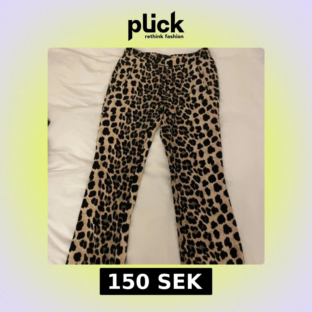 Snygga leopardmönstrade byxor i beige och svart. Byxorna är vad långa med bootcut passform och är perfekta för att sticka ut. De har en klassisk midja och är tillverkade i ett bekvämt material. Passar om man är en större S eller liten M.
