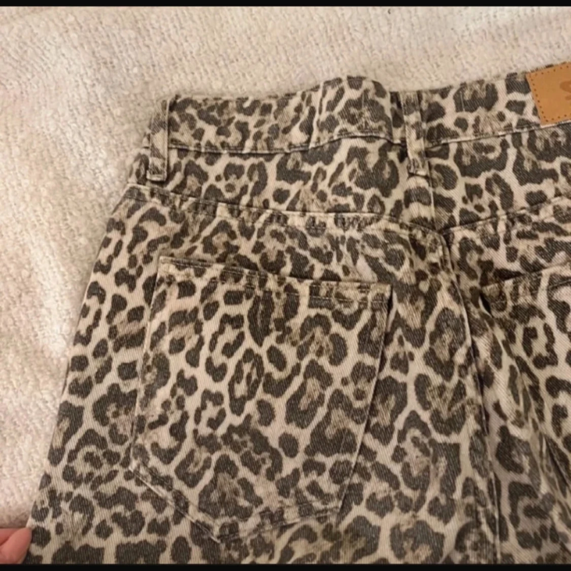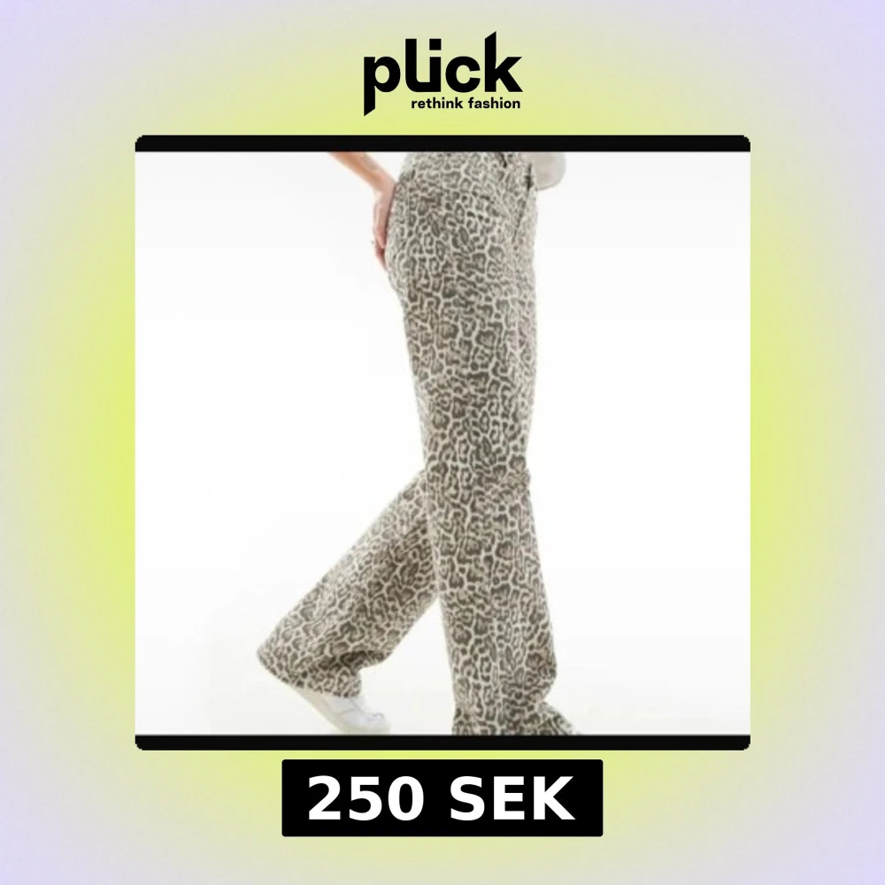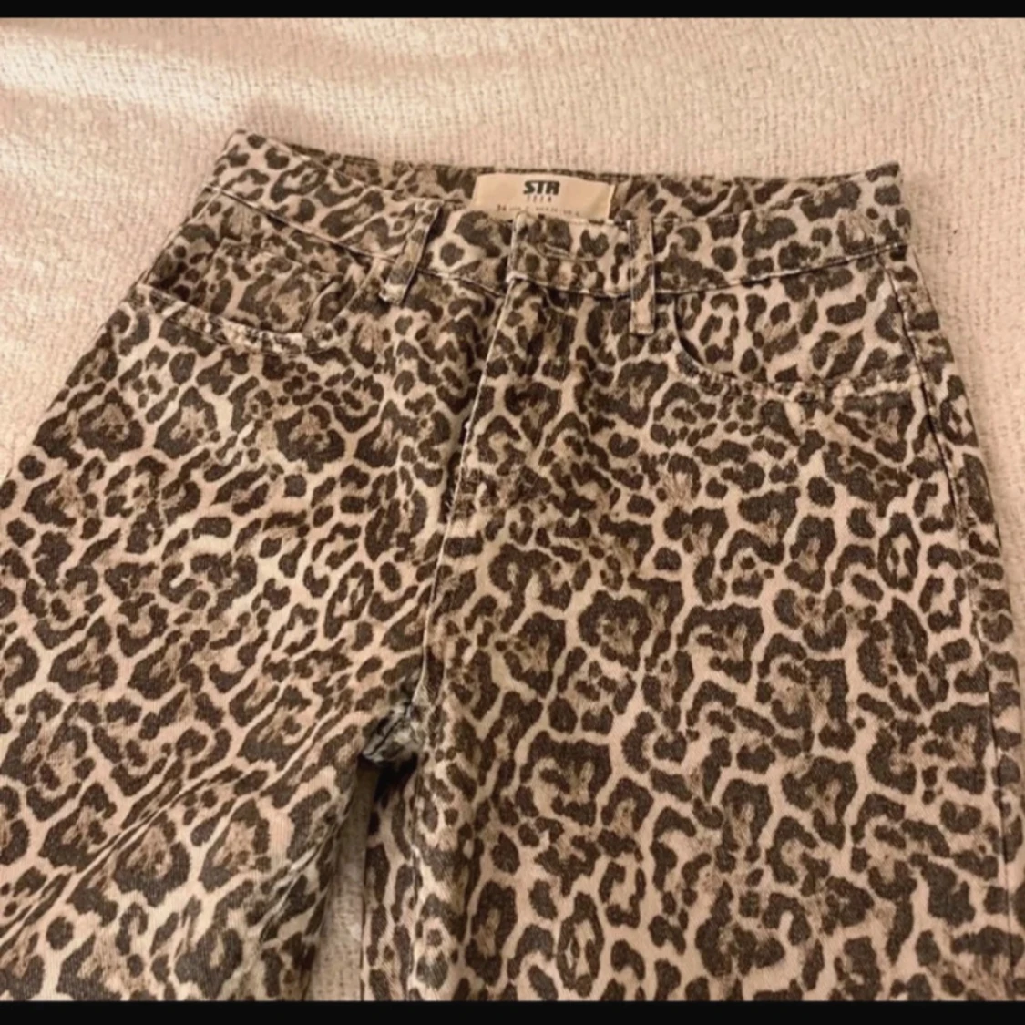 Säljer ett par snygga jeans från STR med leopardmönster i beige och bruna toner. Byxorna har hög midja, raka ben och klassisk femficksdesign. Materialet är kraftigt och känns som klassisk denim. Perfekta för dig som vill sticka ut med ett djuriskt mönster.