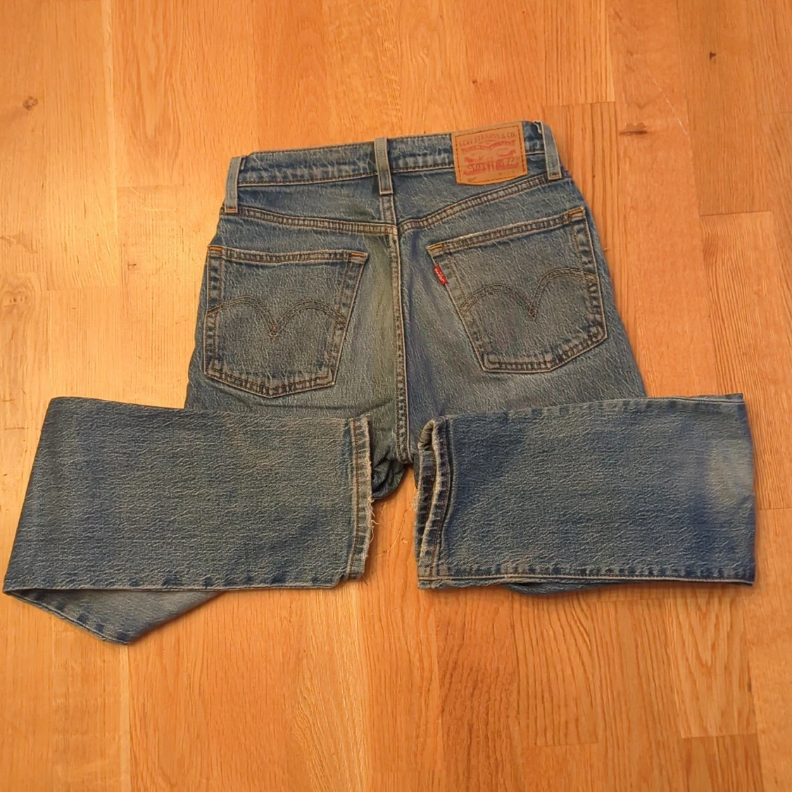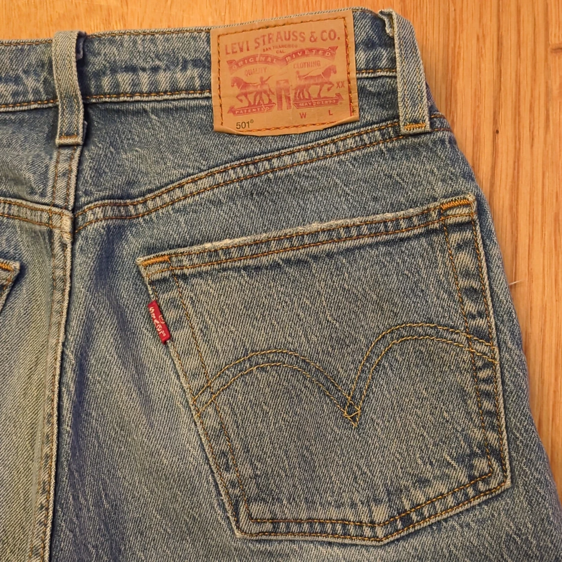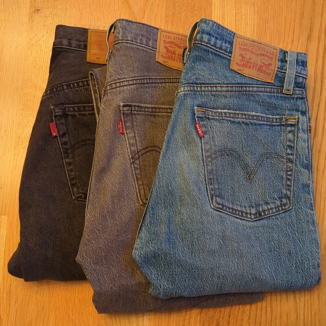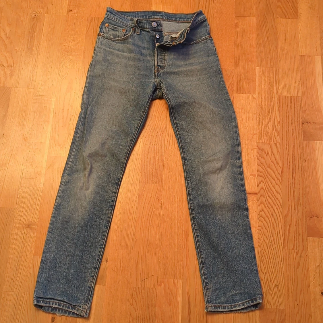 Klassiska Levi's 501 jeans i blå denim med raka ben och knäppning med knappar. Snyggt slitna detaljer och ikonisk läderpatch bak i midjan. Jeansen har fem fickor och orange sömmar. Perfekta för en avslappnad och tidlös stil. Har ett par mörkgrå, ett par ljusgrå och ett par ljusblå. Samma storlek modell och skick. 350:- st eller 800:- för alla tre