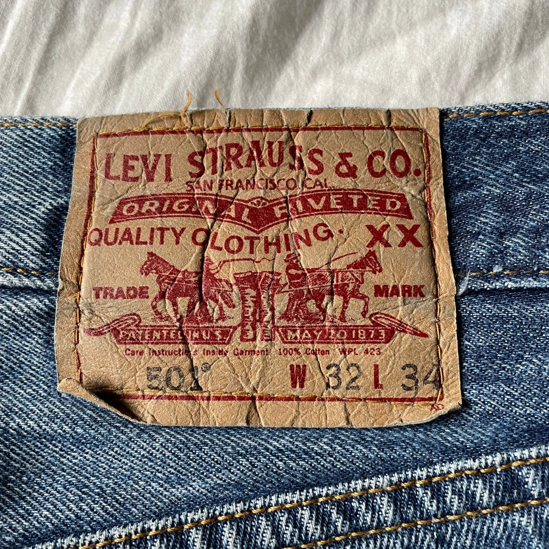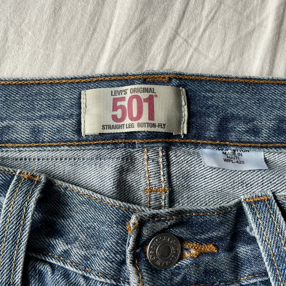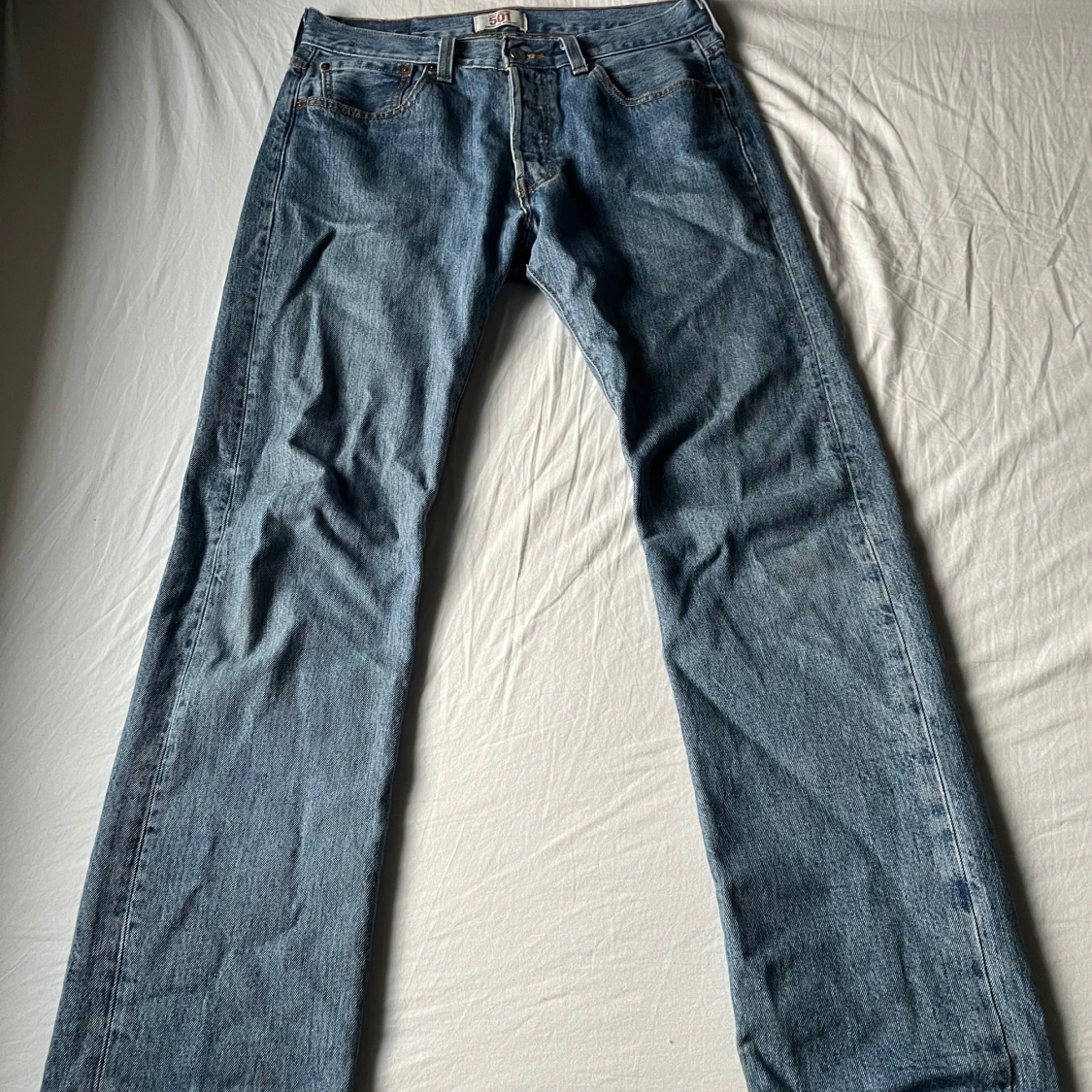 Klassiska Levi's 501 jeans i blå denim med rak passform och knappgylf. Snygg vintagekänsla och tidlös look, perfekta till sneakers eller boots. Hög midja och femficksmodell, tillverkade i bomull för en autentisk jeanskänsla.