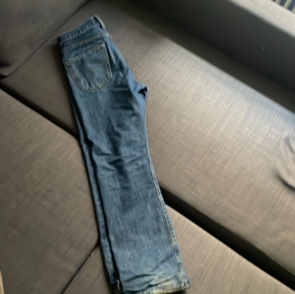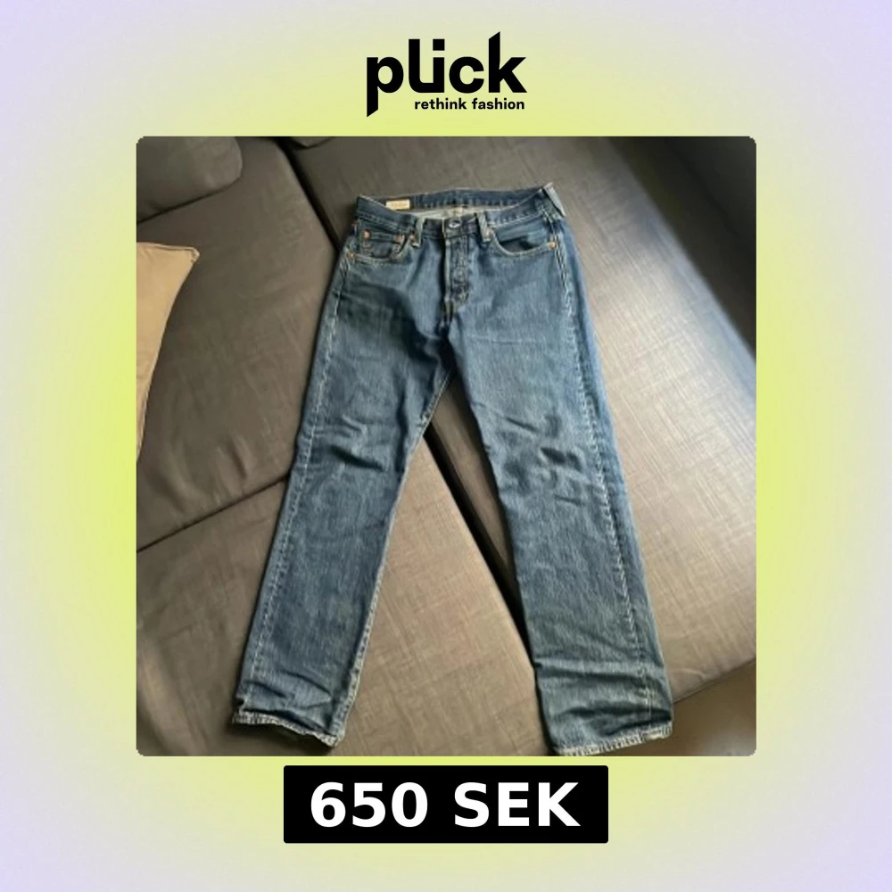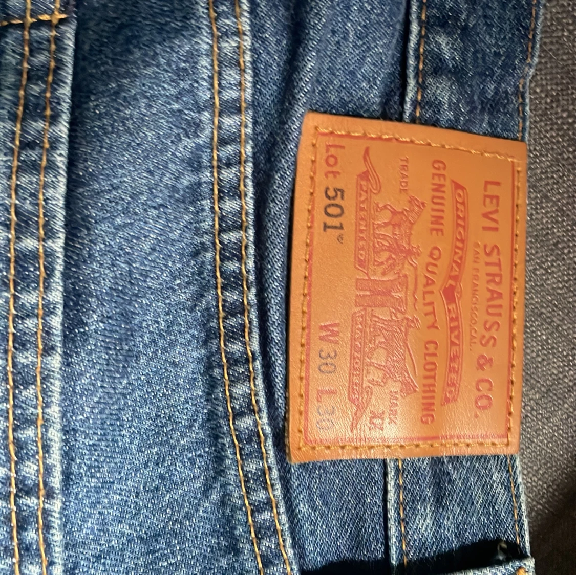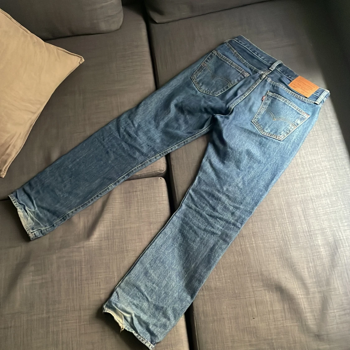 Klassiska blå Levi's 501 jeans med raka ben och femficksmodell. Jeansen har en snygg mellanblå tvätt, knäppning med knappar och detaljer i kopparfärgad metall. Tillverkade i slitstarkt bomullsjeans. Perfekta för en avslappnad och tidlös look.