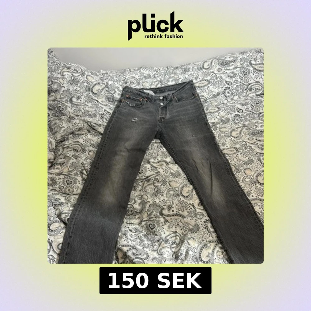 Säljer ett par grå Levi's 501 jeans med klassisk femficksdesign och knäppning fram. Jeansen har en rak passform och slitna detaljer på framsidan för en cool, vintage look. Perfekta till sneakers eller boots. Dom har slitningar och den på höger ben är rätt igenom så man vet det🤩 säljer billigt