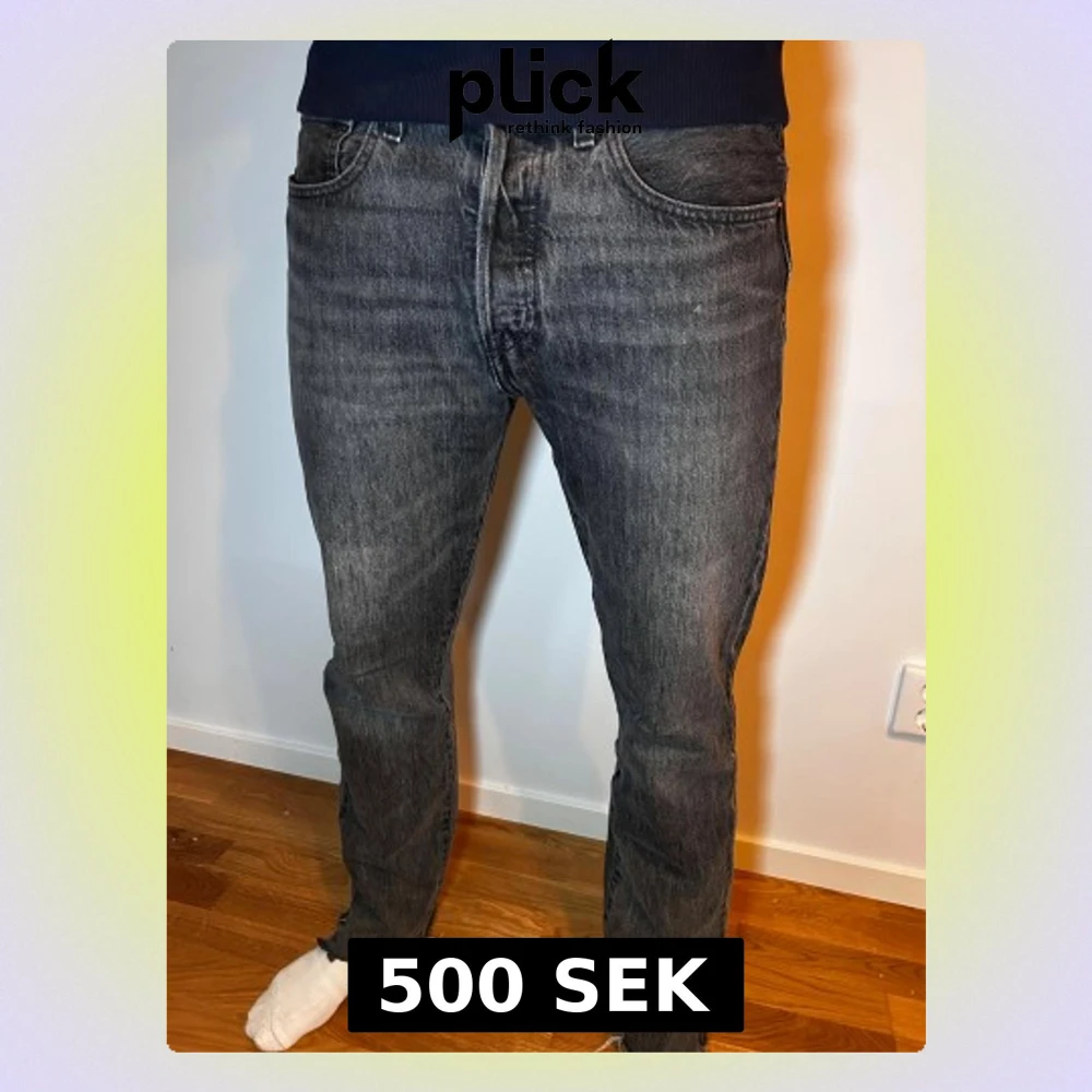 Säljer ett par Levi's 501 jeans i snygg grå tvätt med klassisk rak passform. Jeansen har fem fickor, knappgylf och slitna benslut för en cool vibe. Perfekt för dig som gillar tidlös stil med en modern touch.