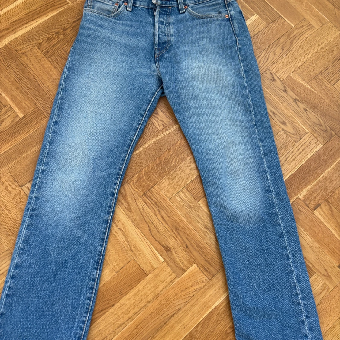 Klassiska Levi's 501 jeans i ljusblå tvätt med raka ben och normal passform. Jeansen har fem fickor, knappgylf och är tillverkade i slitstarkt bomullsjeans. Perfekta för en avslappnad och tidlös stil. Storlek 30- 32