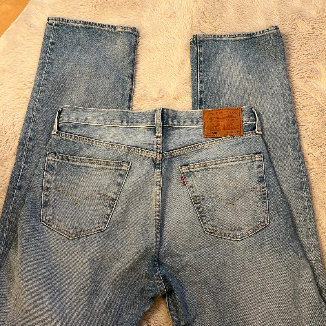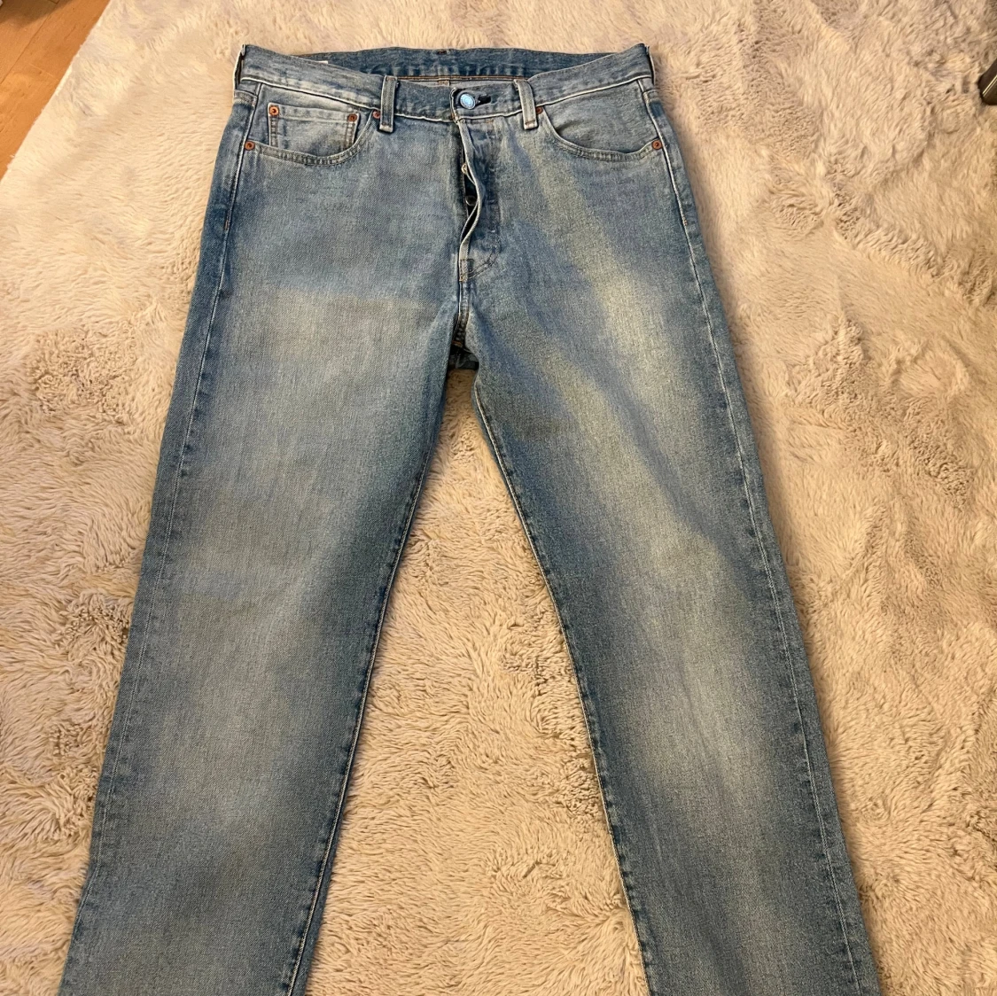 Klassiska ljusblå Levi's 501 jeans med raka ben och normal passform. Jeansen har fem fickor, knappgylf och den ikoniska läderpatchen bak i midjan. Tillverkade i slitstarkt bomullsjeansmaterial, perfekt för en avslappnad stil.