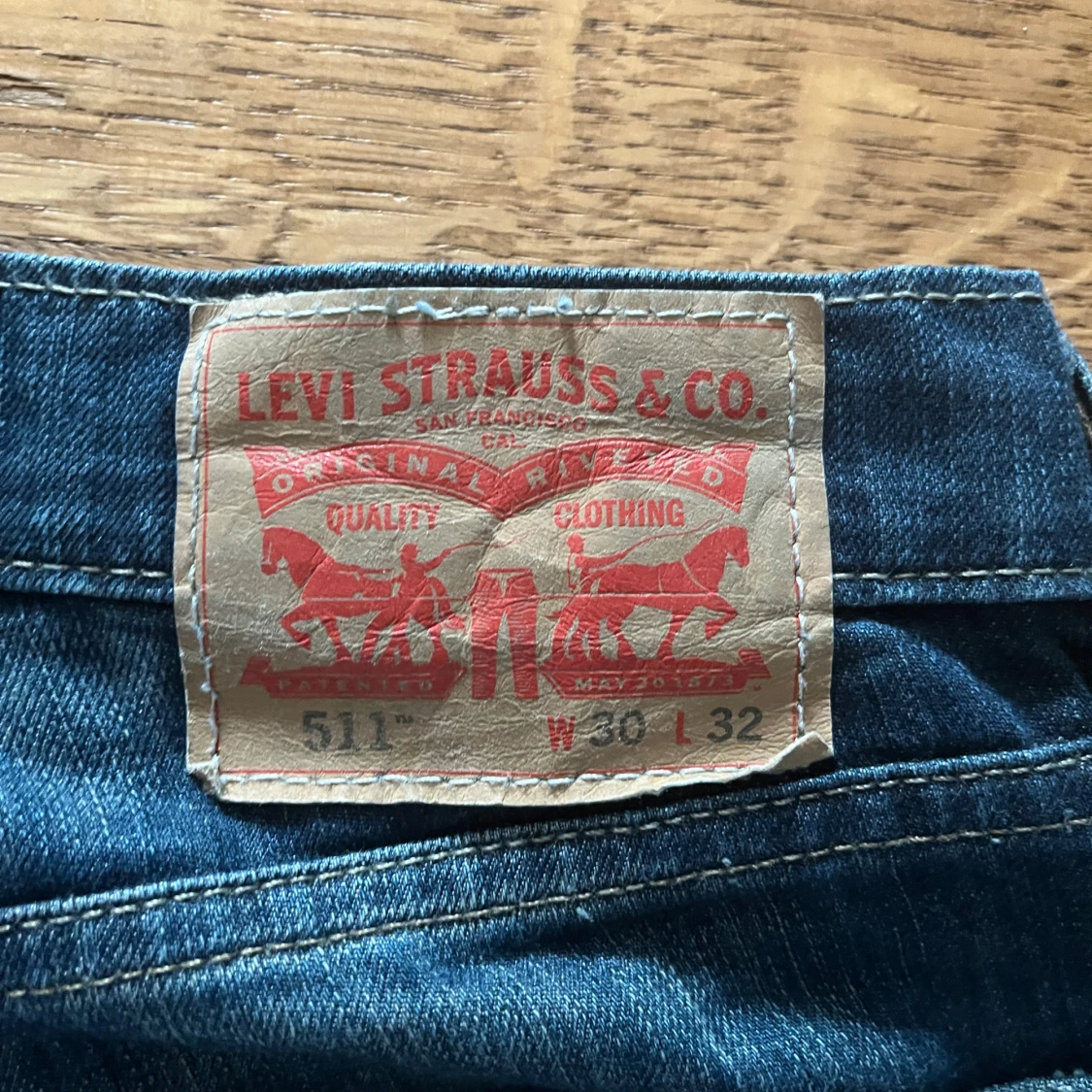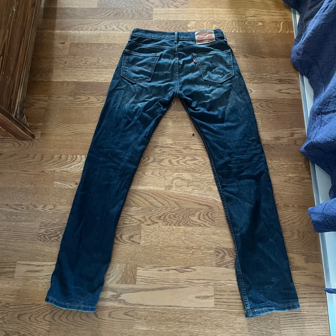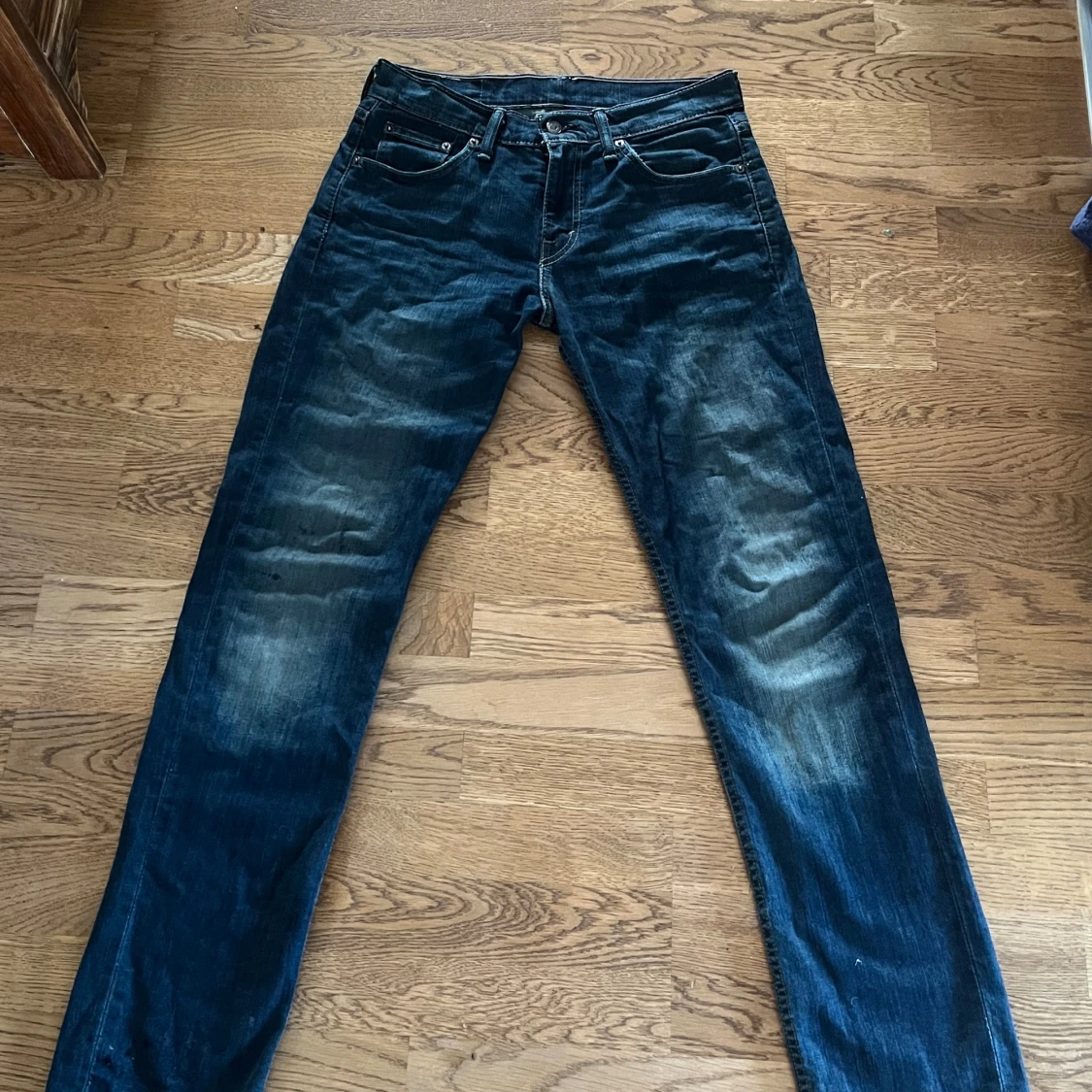 Säljer ett par Levi's 511 jeans i mörkblå tvätt med snygga slitningar. Modellen är slim och har klassisk femficksdesign, knapp och dragkedja fram. Jeansen är tillverkade i jeansmaterial och har en modern, smal passform som sitter riktigt bra.