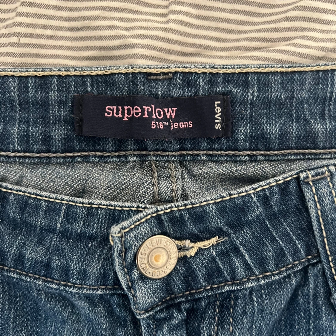 Säljer ett par Levi's 518 Superlow jeans i klassisk blå tvätt. Jeansen är sjukt snygga men säljer pågrund av att de är för stora 🫶🏼 de har lite slitage lägsta ner men inget som man märker.