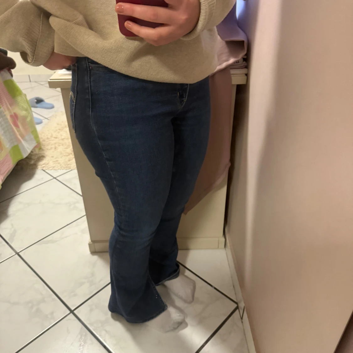 Snygga blå jeans från Levi's med klassisk femficksdesign och bootcut-ben. Jeansen har hög midja och är tillverkade i mjukt denim med lätt stretch. De har slitstarka sömmar och en liten slits vid benslutet för extra stil. Perfekt passform och ikonisk Levi's-detalj på bakfickan.