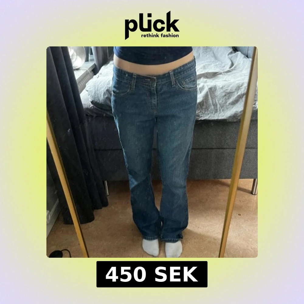 Säljer ett par klassiska blå Levi's jeans med bootcut och låg midja. Jeansen har snygga kontrastsömmar och stretchigt denimtyg. Köpta i en resell jeansbutik så har inte koll på om de har används sedan innan, oavsett är de fortfarande i väldigt bra skick. Inga synliga defekter.
