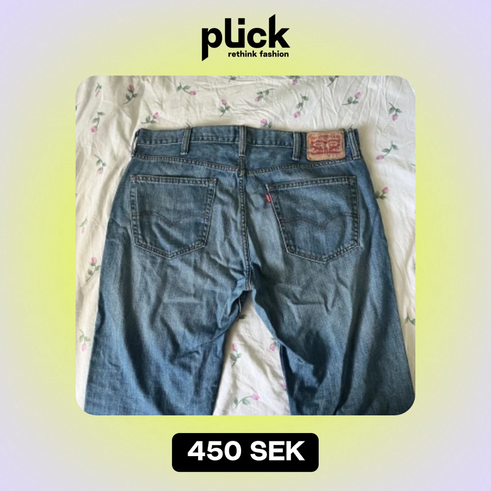 Levi’s jeans i storlek 38/30 vilket motsvarar ungefär en storlek L-XL. Midjemåttet tvärsöver är ca 50cm (ungefär 100cm runtom hela) och innerbenslängden är ca 77cm långt.