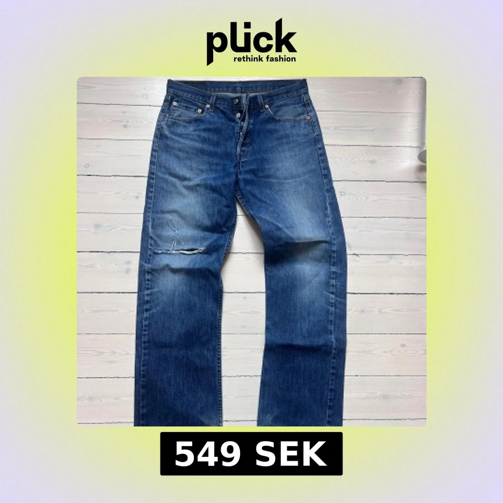 Klassiska Levi's 501 jeans i blå denim med rak passform och snyggt sliten look. Byxorna har ett stort hål på vänster knä, fem fickor och knappgylf. Perfekta för dig som gillar en avslappnad och vintage-inspirerad stil. W31 L34 modell 187cm 74kg Mad vintage