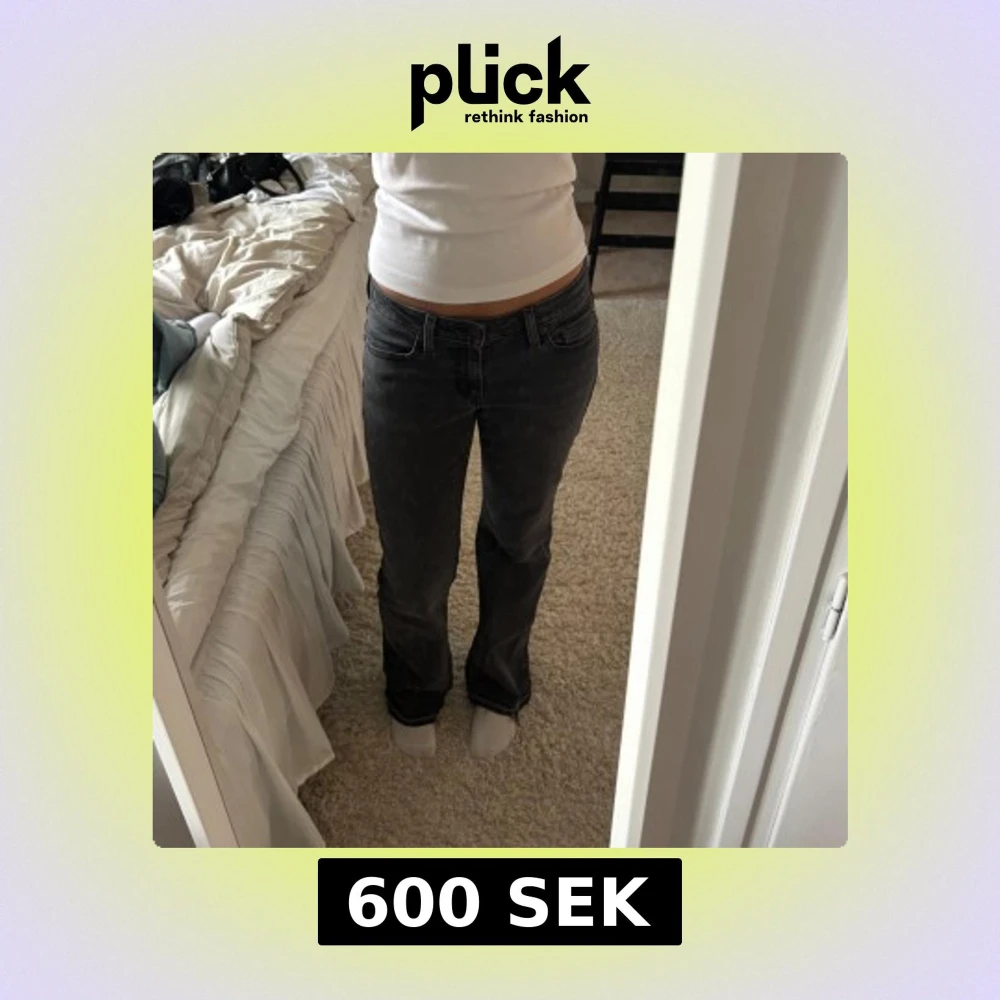 Säljer ett par grå Levi's Superlow Bootcut jeans i storlek 28. De är upp sprättade nedtill men annars inga skador💞jag är 170 lång