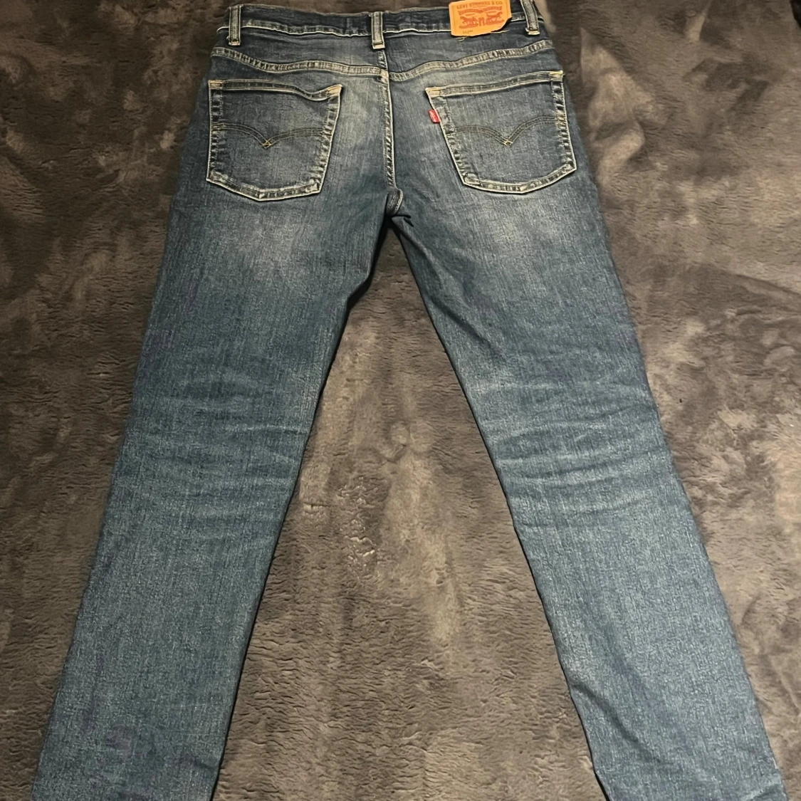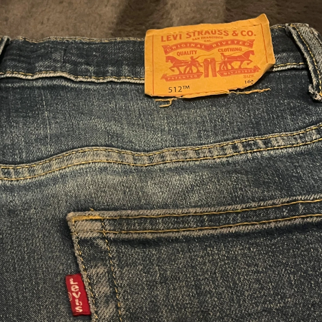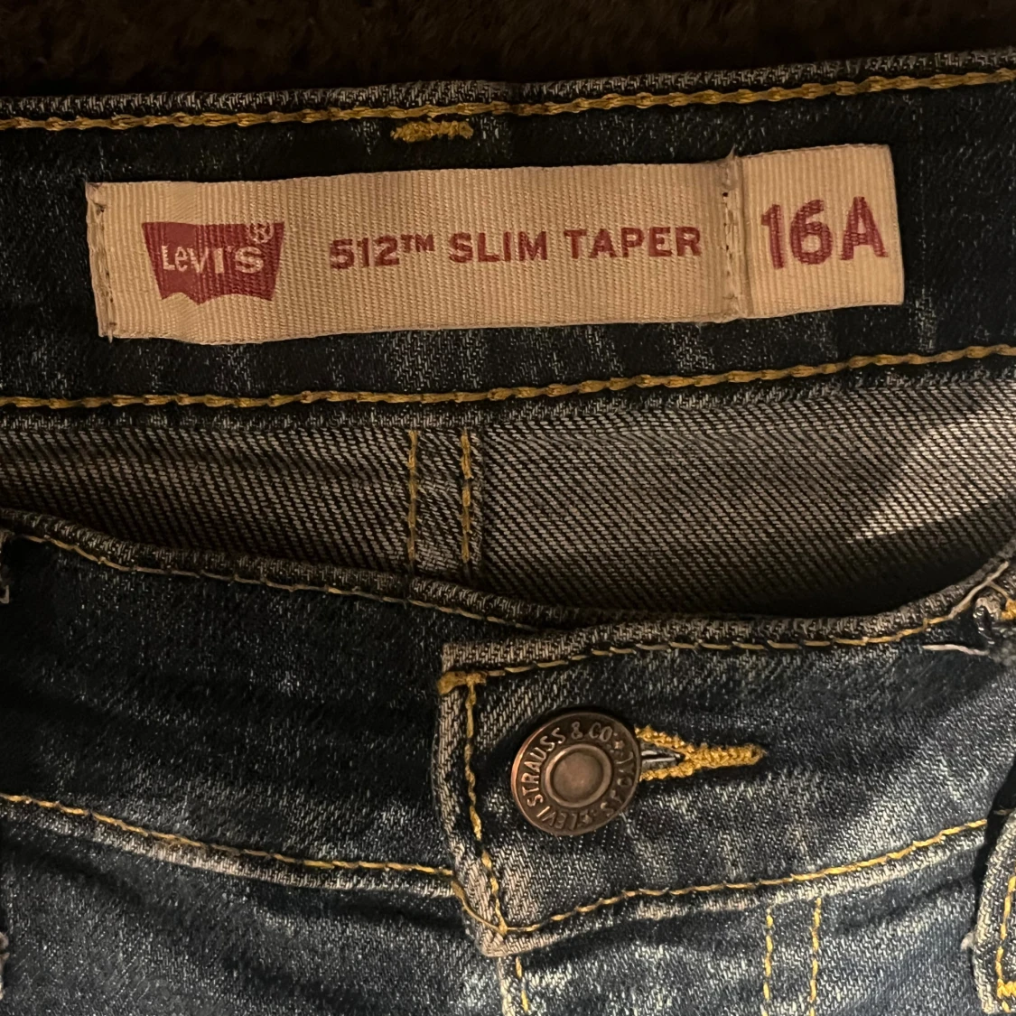 Säljer ett par Levi's 512 Slim Taper jeans i klassisk blå tvätt med snygga slitningar. Jeansen har fem fickor, gul kontrastsöm och röd Levi's-tag på bakfickan. Modellen är smal med avsmalnande ben och passar perfekt för en trendig look.