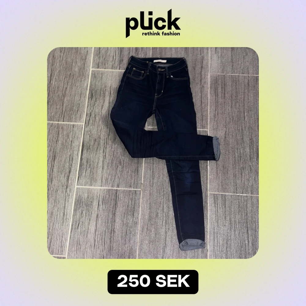 Säljer ett par snygga Levi's 721 High Rise Skinny jeans i mörkblå färg. De är högmidjade och har en tight passform som framhäver figuren.