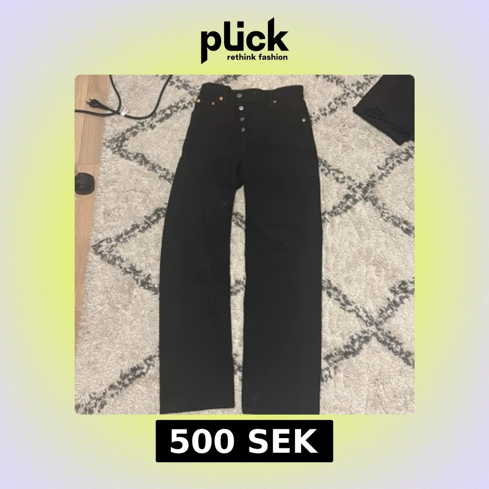 Säljer ett par svarta Levi's Ribcage Straight jeans. De har en hög midja och raka ben, vilket ger en klassisk look. Jeansen har knappar framtill och den ikoniska Levi's-lappen baktill. Perfekta för en stilren outfit!