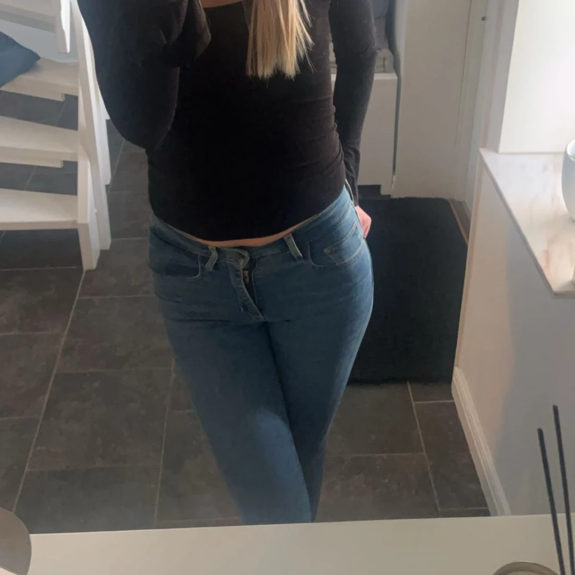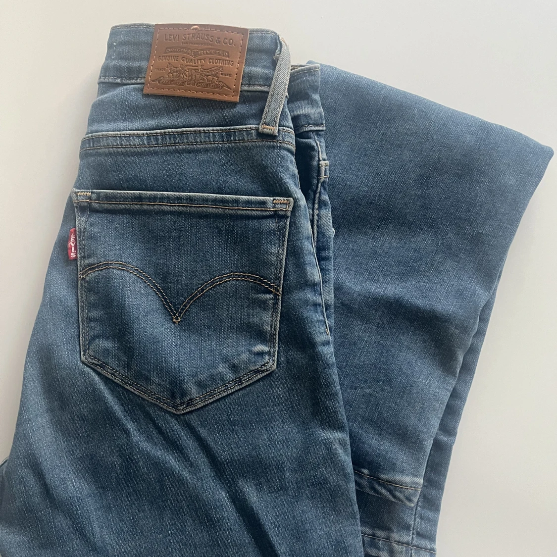 Blåa Levi’s high rise bootcut jeans i W 24 L32. Säljes då de är för små, endast använda ett fåtal gånger!!🤍